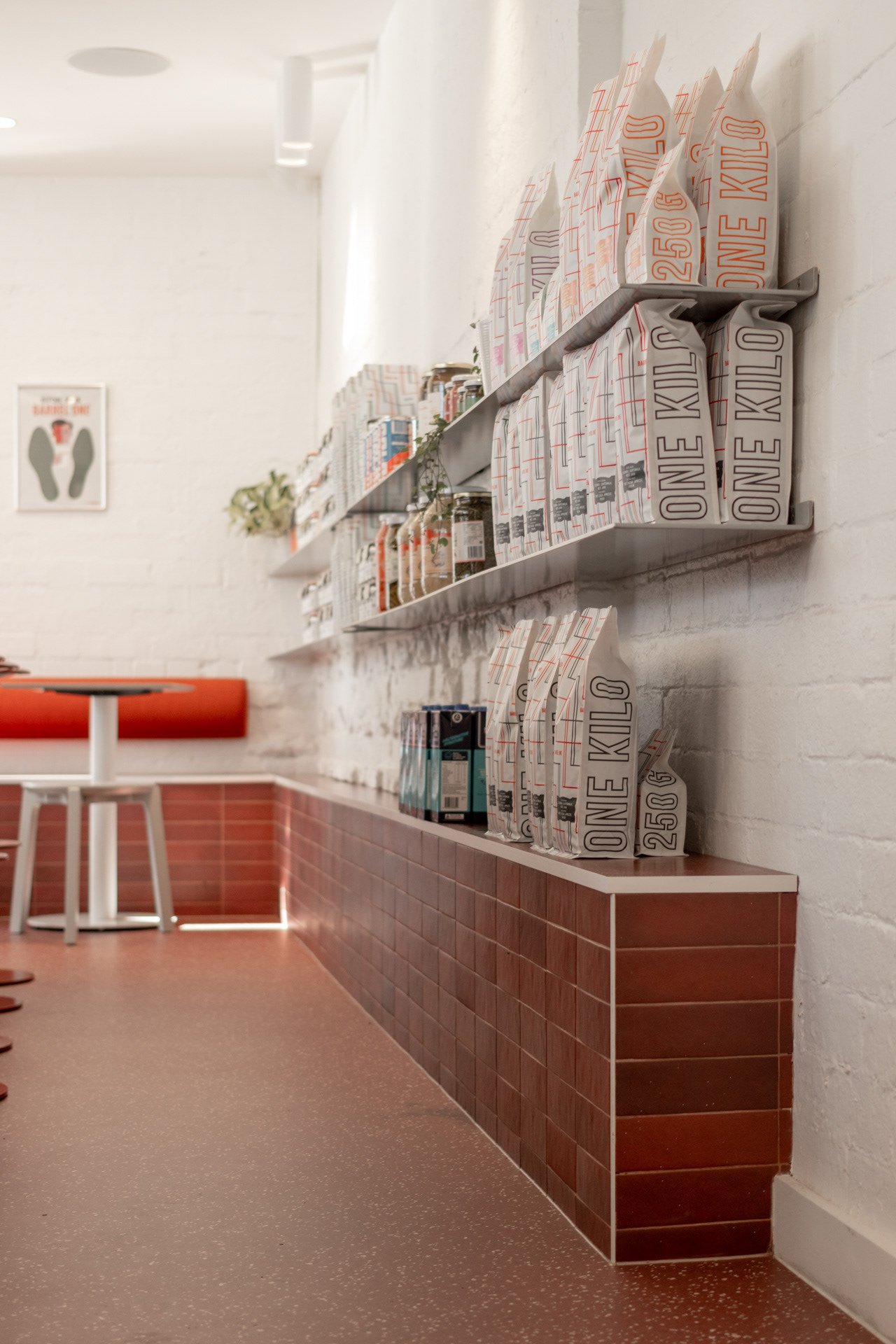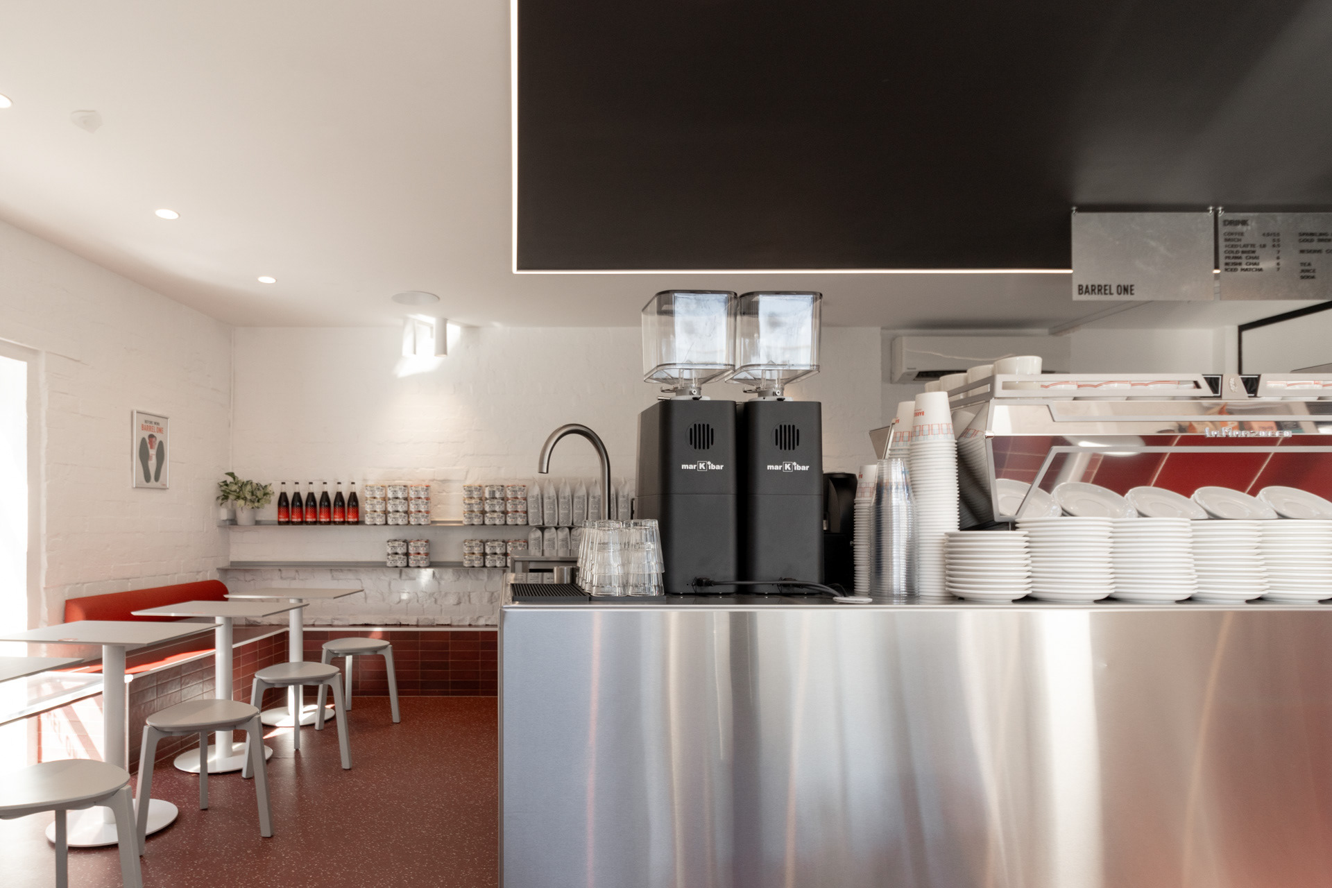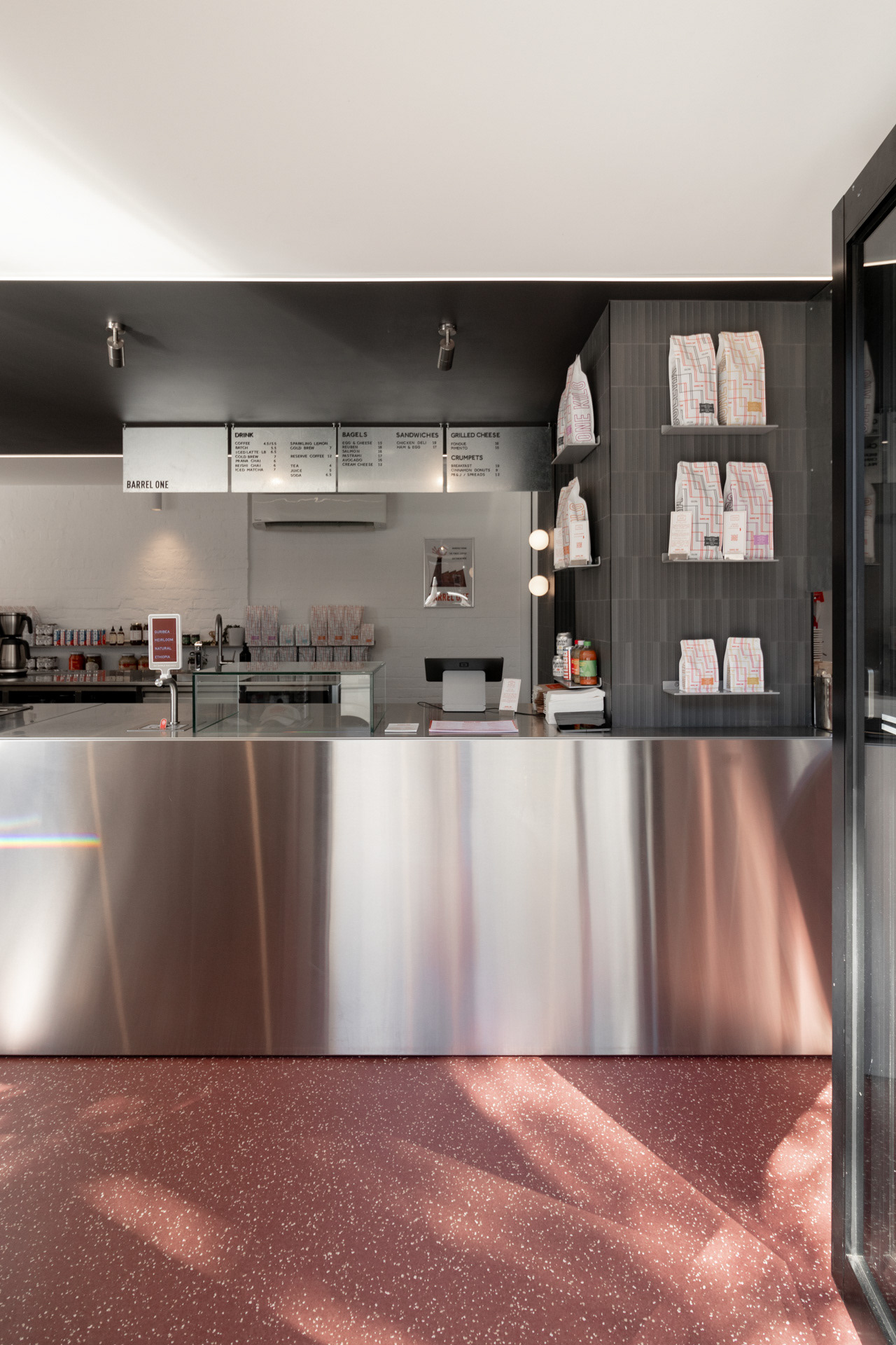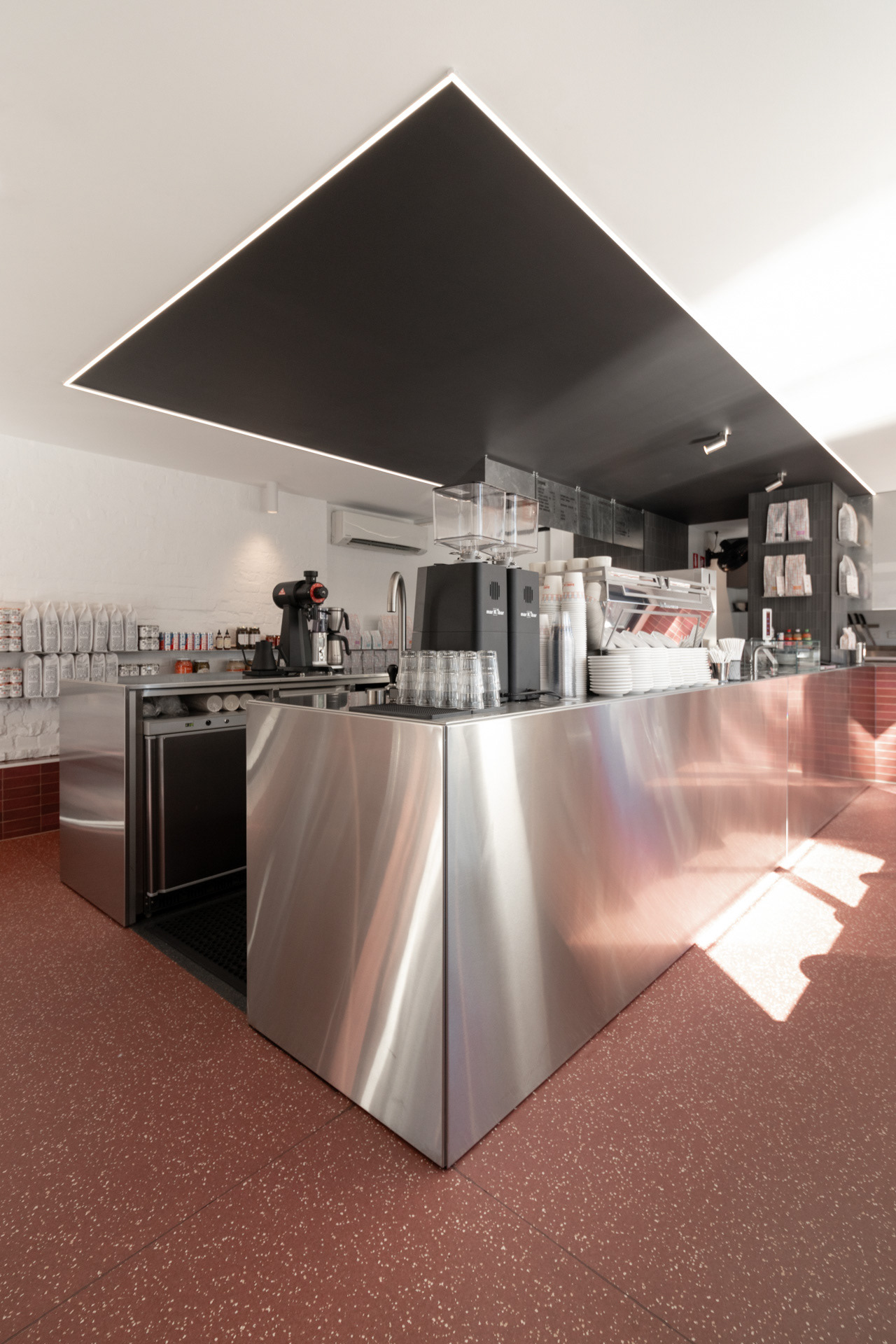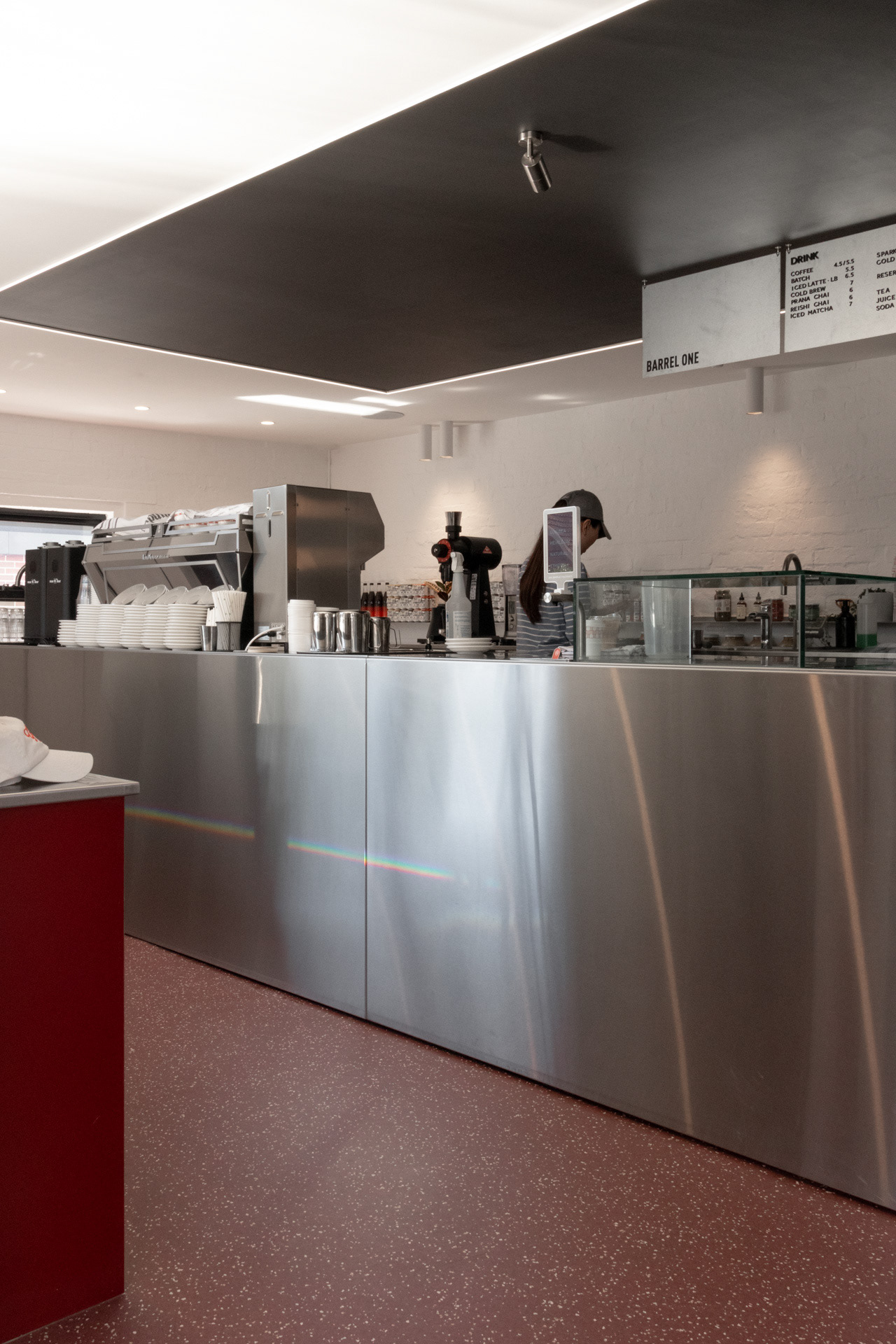 This was the third venue designed for Barrel One Coffee Roasters, located within the newly developed Lane Cove ‘Canopy’ district. The café had a number of pre-existing constraints that added complexity to development of the spatial organisation. The existing services, entry door & windows, bathroom location and ceiling heights had to be maintained, whilst allowing for the café’s specialised equipment and requirements. This had to be done whilst maximising the usable space for café operations, allowing for take-away ordering & pickup, as well as providing adequate dine-in seating. The café’s materiality borrows elements from previous Barrel One venues, elevated slightly to better harmonise with the surrounding district. The venue features dark tones and mitred stainless steel benching, contrasted with the Barrel One Brand Red, bathing the floors and seating. Due to the reduced space and low ceilings, finishes were creatively used to demarcate between staff areas and public areas, creating clearly defined zones without obtrusive physical boundaries.