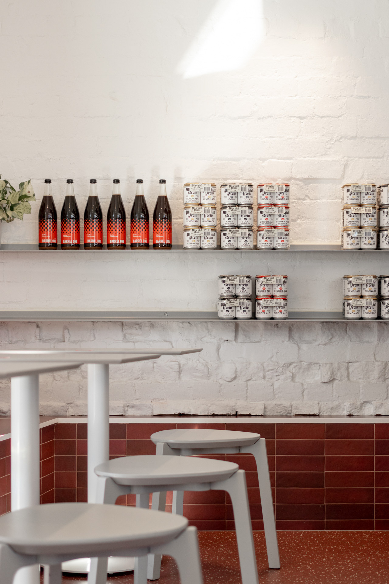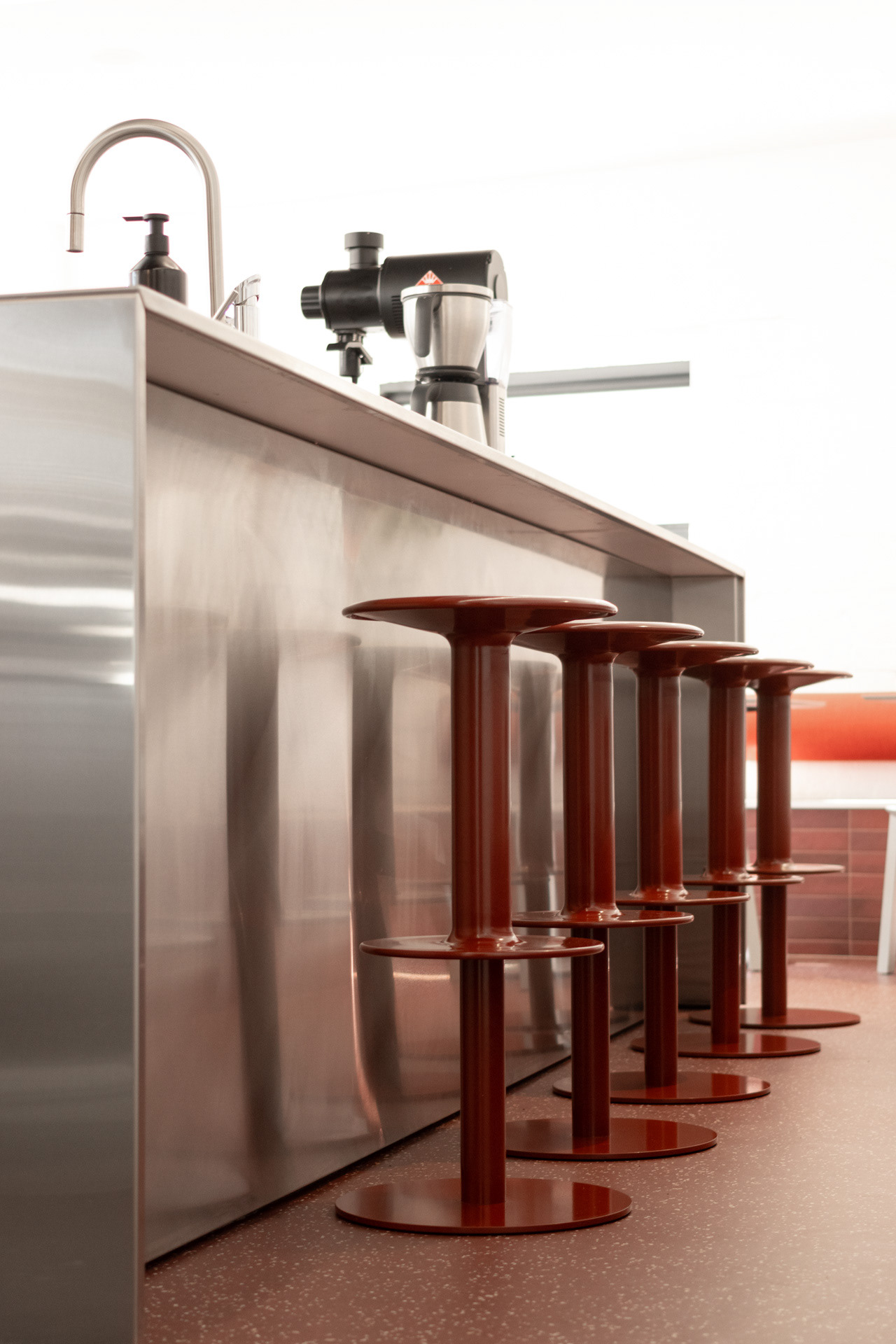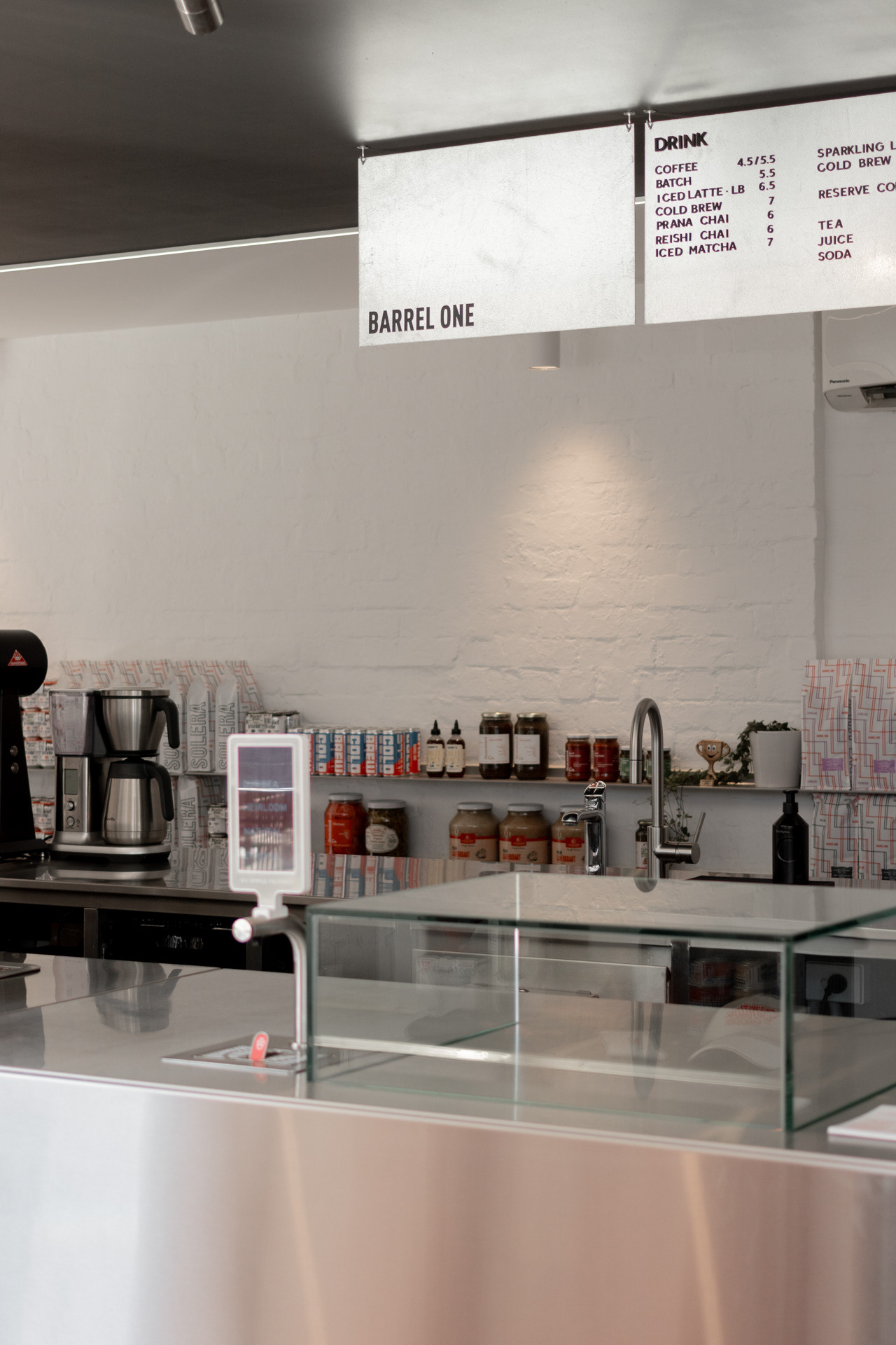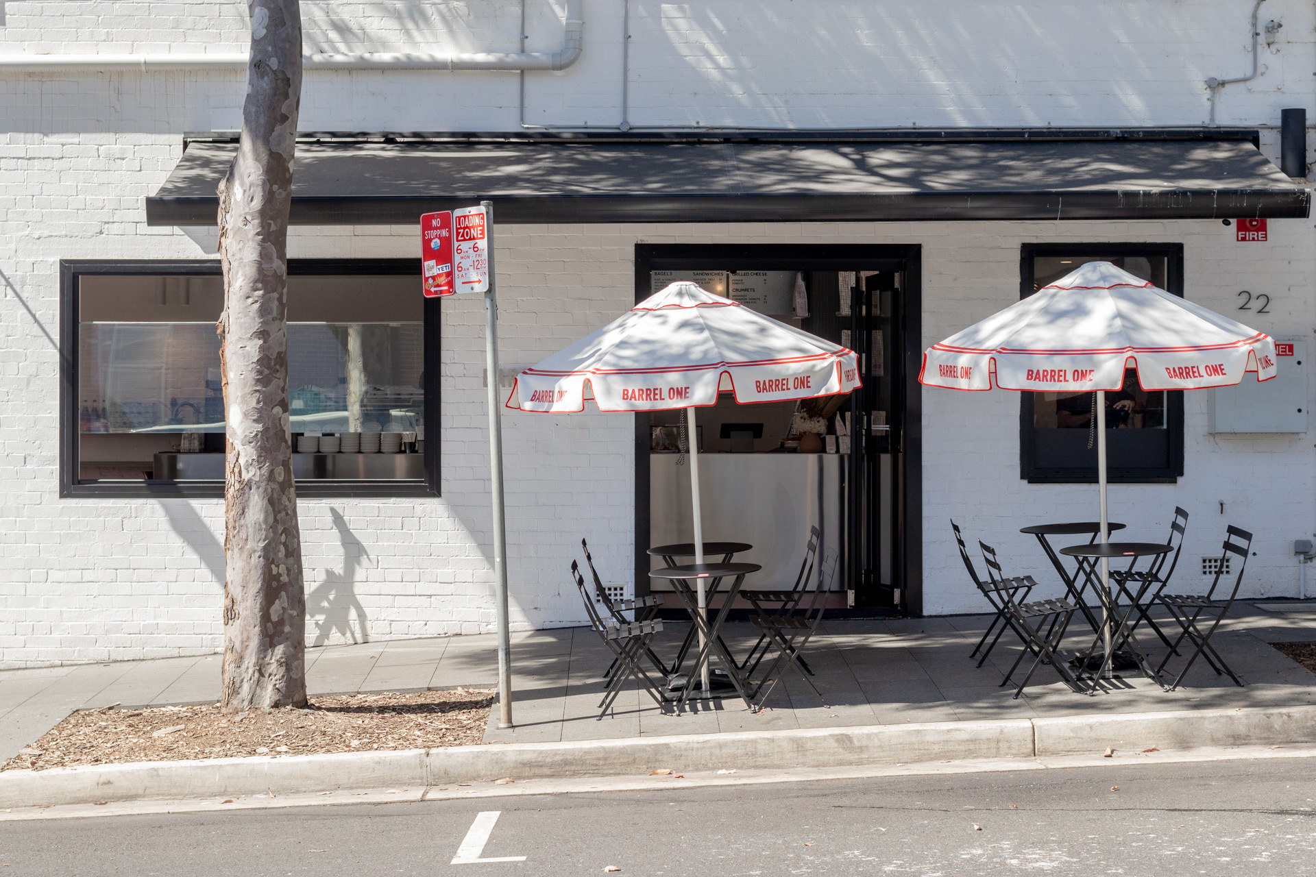 This was the third venue designed for Barrel One Coffee Roasters, located within the newly developed Lane Cove ‘Canopy’ district. The café had a number of pre-existing constraints that added complexity to development of the spatial organisation. The existing services, entry door & windows, bathroom location and ceiling heights had to be maintained, whilst allowing for the café’s specialised equipment and requirements. This had to be done whilst maximising the usable space for café operations, allowing for take-away ordering & pickup, as well as providing adequate dine-in seating. The café’s materiality borrows elements from previous Barrel One venues, elevated slightly to better harmonise with the surrounding district. The venue features dark tones and mitred stainless steel benching, contrasted with the Barrel One Brand Red, bathing the floors and seating. Due to the reduced space and low ceilings, finishes were creatively used to demarcate between staff areas and public areas, creating clearly defined zones without obtrusive physical boundaries.