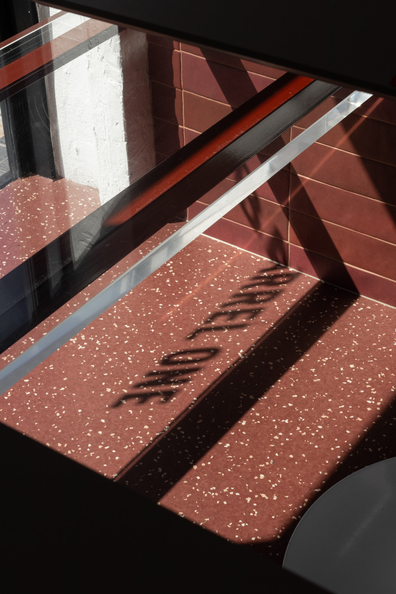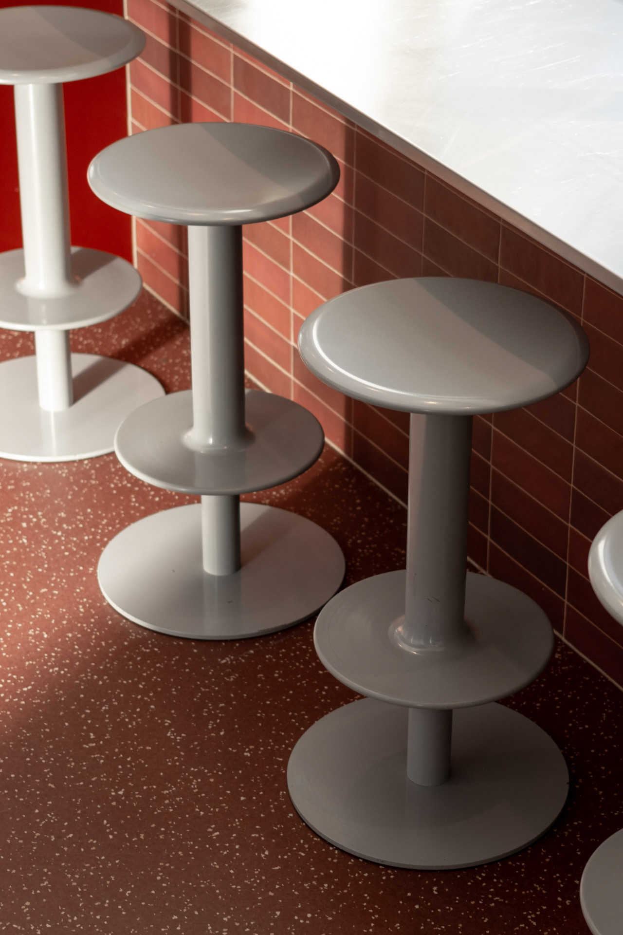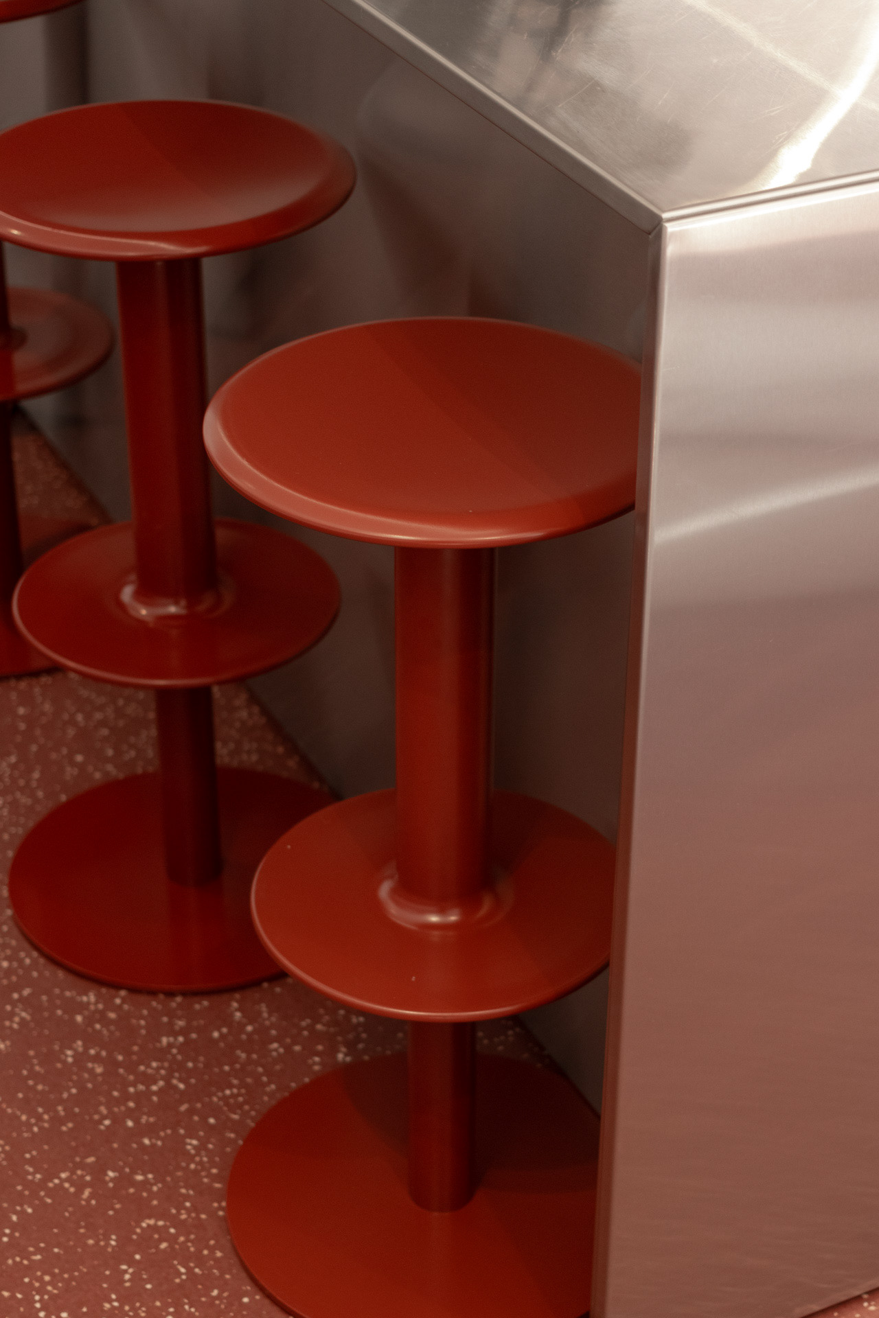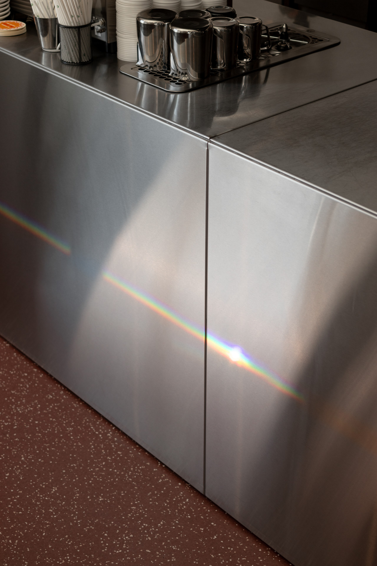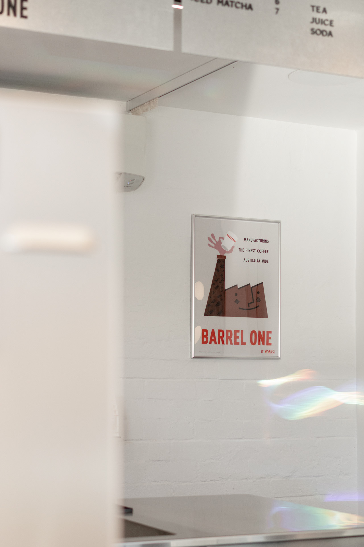 This was the third venue designed for Barrel One Coffee Roasters, located within the newly developed Lane Cove ‘Canopy’ district. The café had a number of pre-existing constraints that added complexity to development of the spatial organisation. The existing services, entry door & windows, bathroom location and ceiling heights had to be maintained, whilst allowing for the café’s specialised equipment and requirements. This had to be done whilst maximising the usable space for café operations, allowing for take-away ordering & pickup, as well as providing adequate dine-in seating. The café’s materiality borrows elements from previous Barrel One venues, elevated slightly to better harmonise with the surrounding district. The venue features dark tones and mitred stainless steel benching, contrasted with the Barrel One Brand Red, bathing the floors and seating. Due to the reduced space and low ceilings, finishes were creatively used to demarcate between staff areas and public areas, creating clearly defined zones without obtrusive physical boundaries.