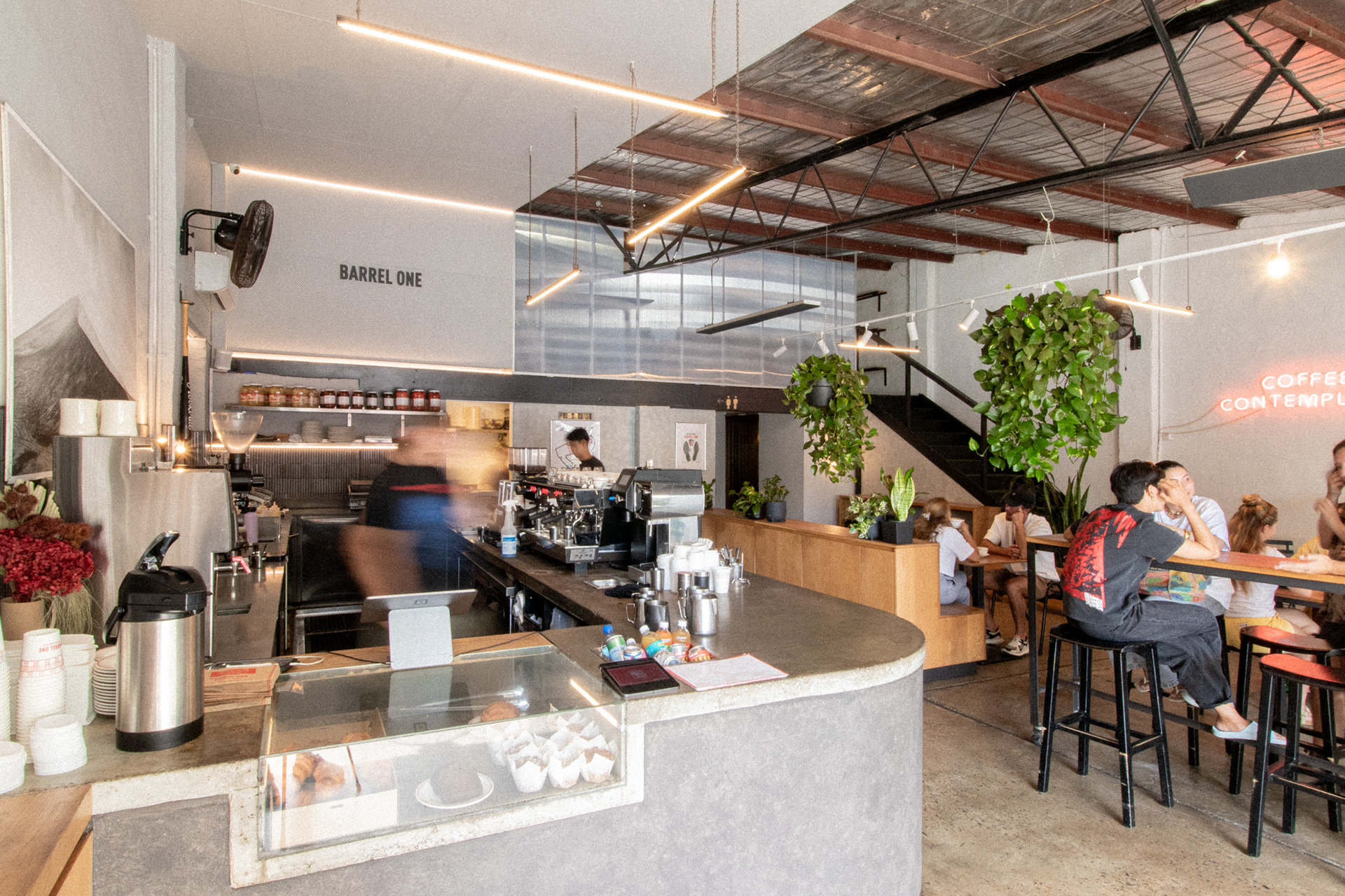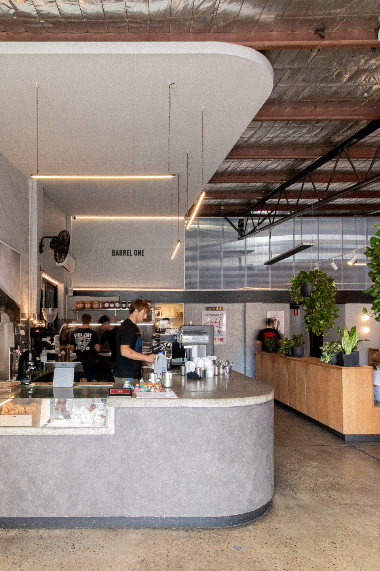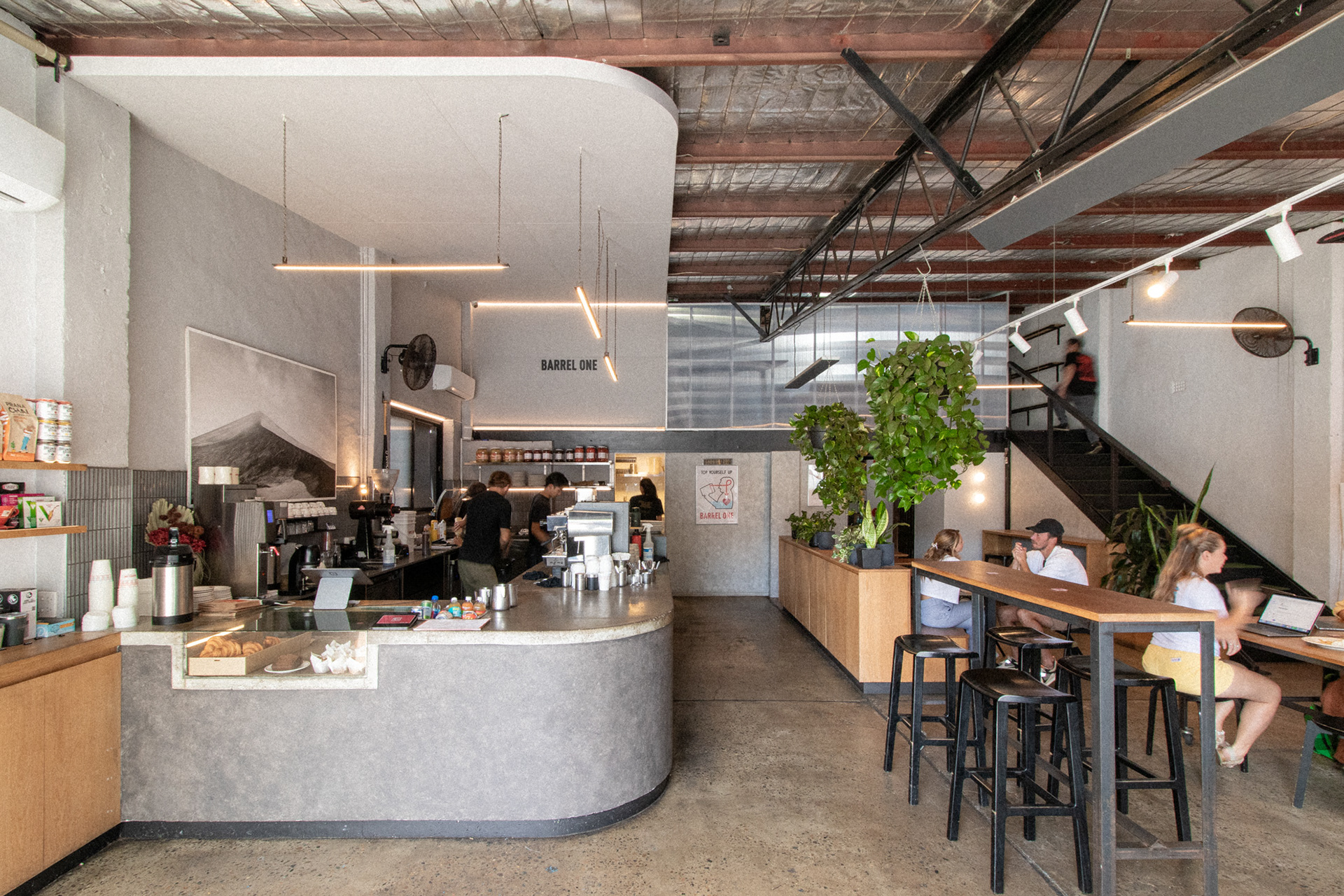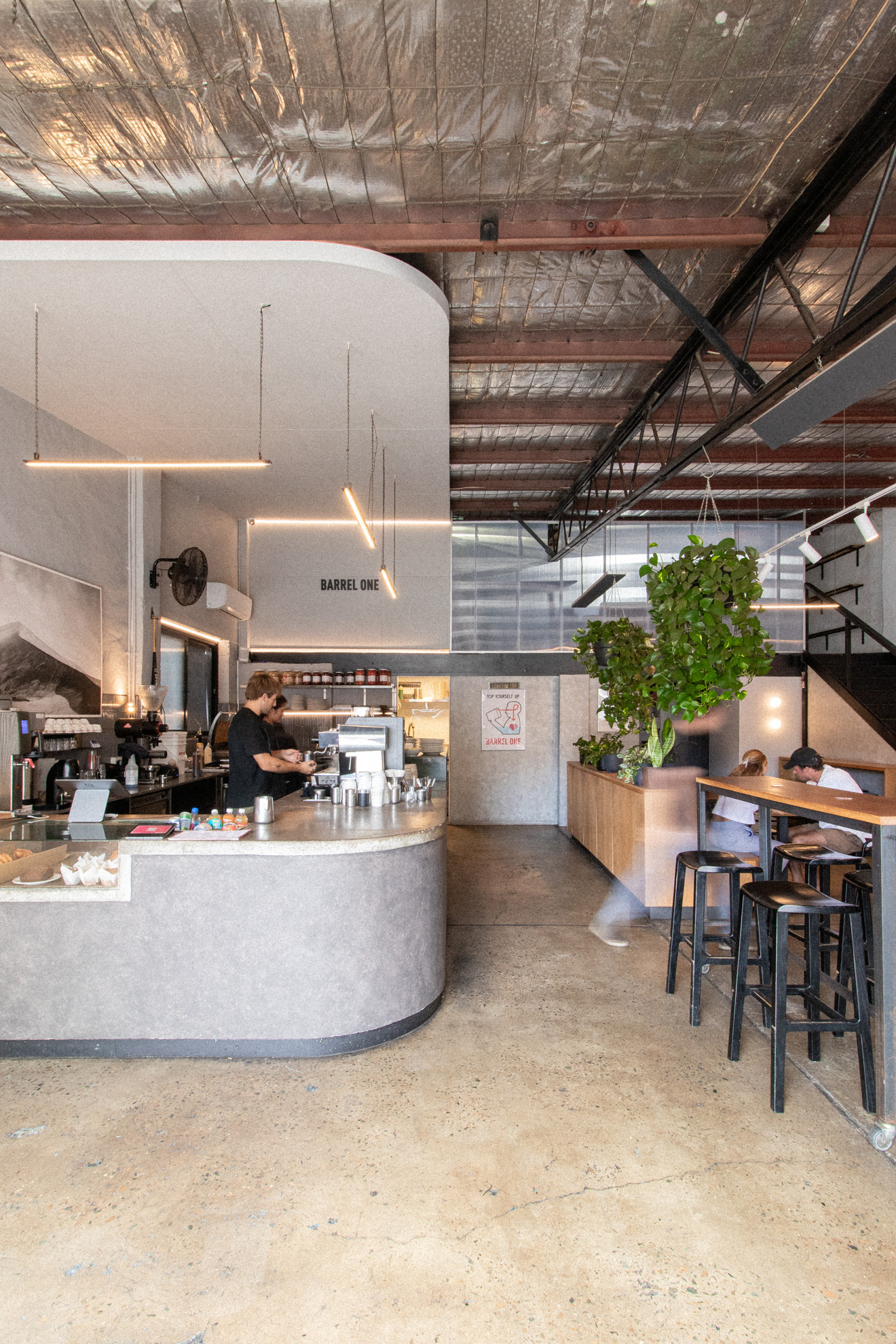 This was the fourth venue designed for Barrel One Coffee Roasters, located in Brookvale. This venue is Barrel One's first and flagship venue, originally fit out over 10 years prior. The location needed a refresh to finishes and a few functional adjustments for process and staff flow. Much of the original fitout was retained but new finishes and fittings were introduced to bring the venue in line with newer venues. Located in a warehouse within an industrial area, this aesthetic was respected, opting for cool concrete tones and steel highlights. Smart choices had to made in terms of materials and systems to ensure shut down of the premises for renovation would be limited to a few days. The project also included renovation of external finishes, external dining area planning and design of elements such as external benches and umbrellas.