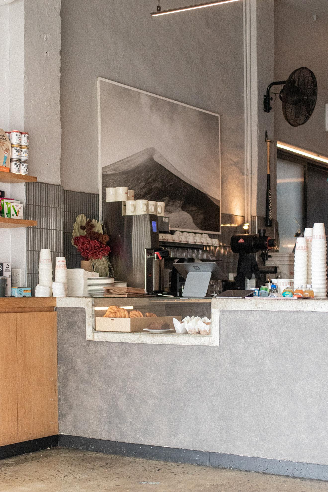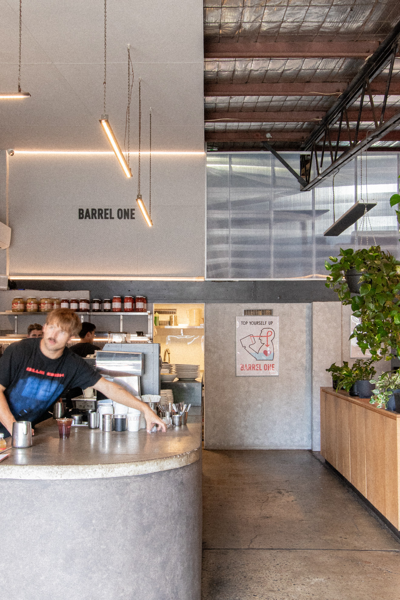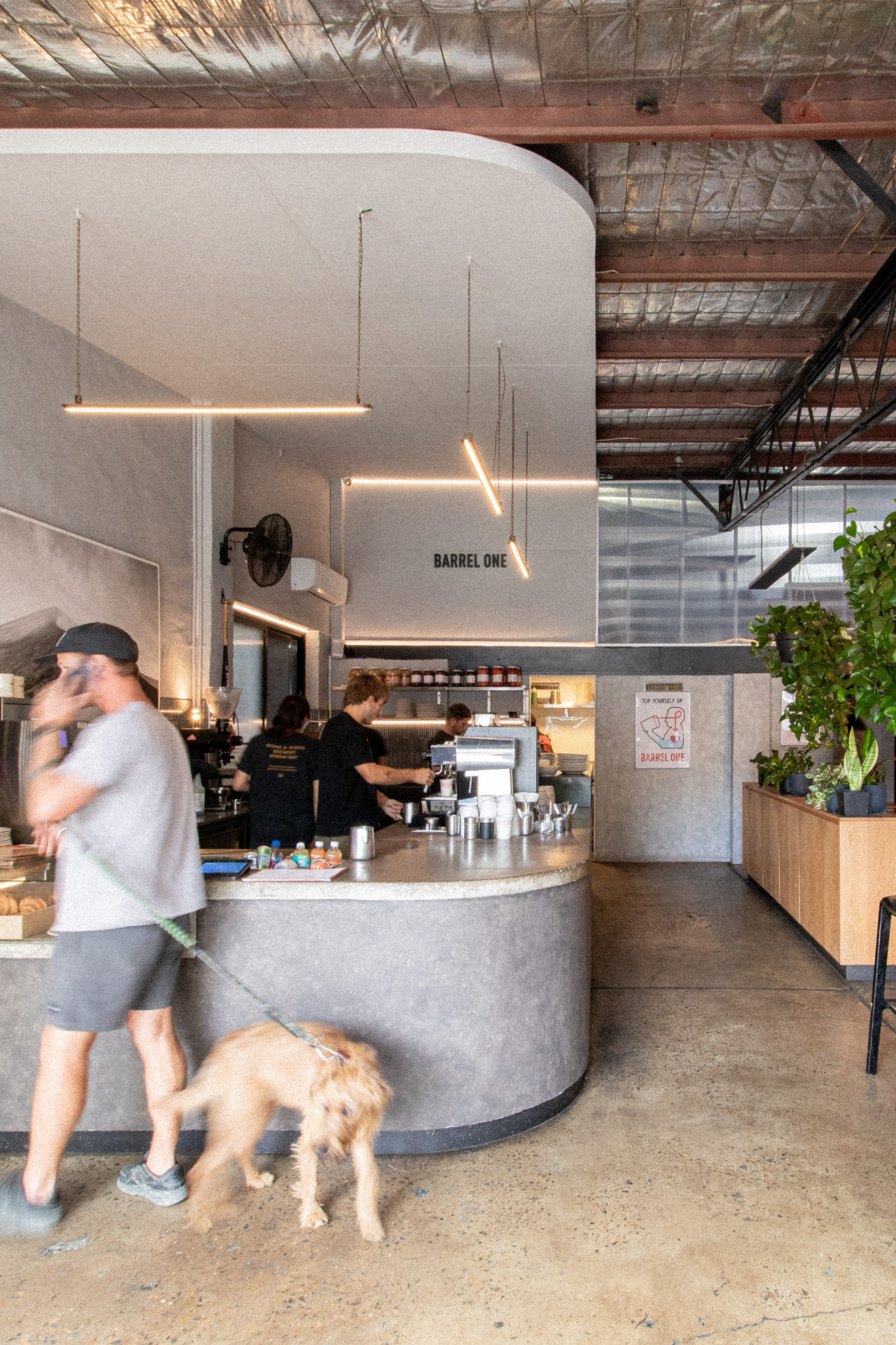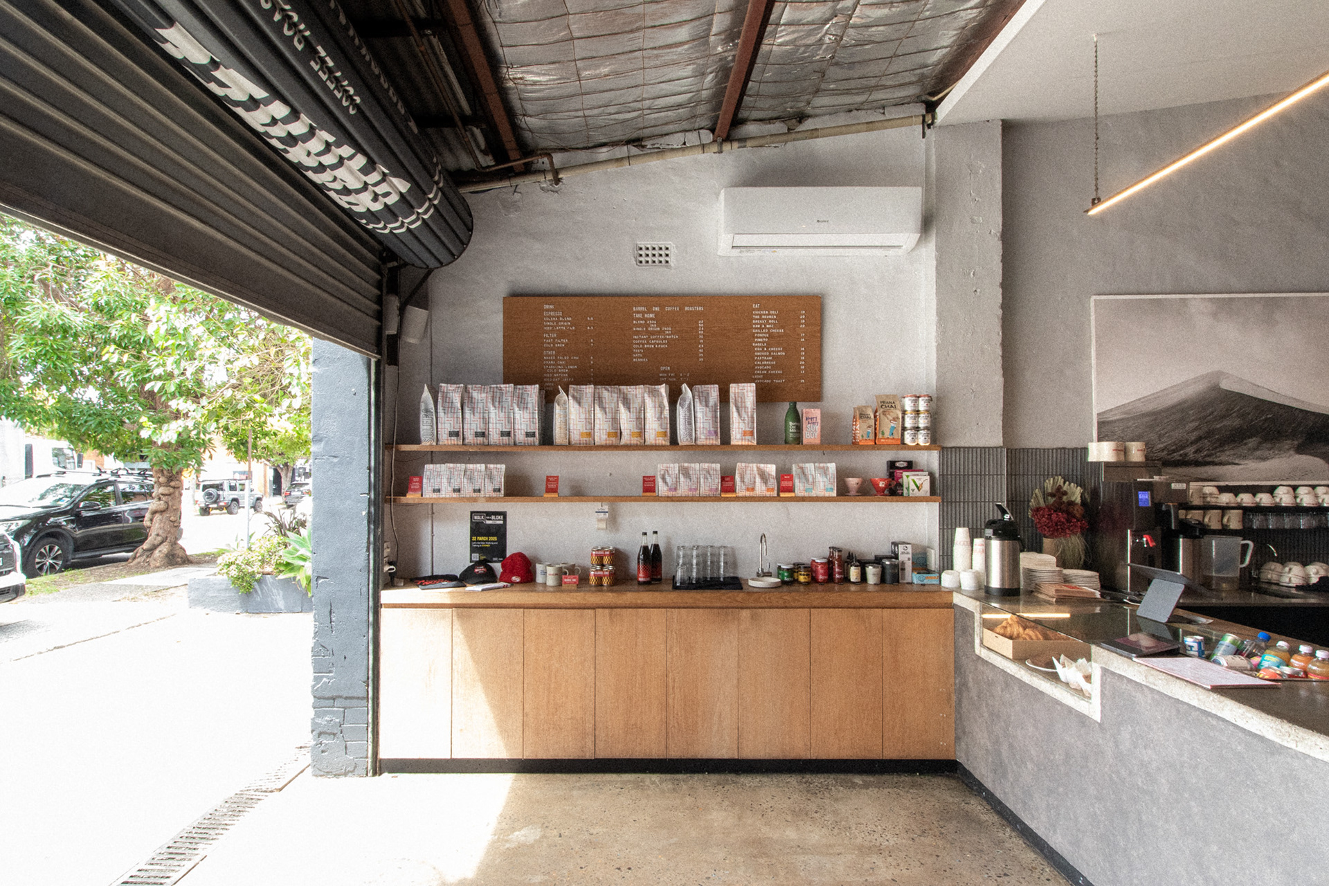 This was the fourth venue designed for Barrel One Coffee Roasters, located in Brookvale. This venue is Barrel One's first and flagship venue, originally fit out over 10 years prior. The location needed a refresh to finishes and a few functional adjustments for process and staff flow. Much of the original fitout was retained but new finishes and fittings were introduced to bring the venue in line with newer venues. Located in a warehouse within an industrial area, this aesthetic was respected, opting for cool concrete tones and steel highlights. Smart choices had to made in terms of materials and systems to ensure shut down of the premises for renovation would be limited to a few days. The project also included renovation of external finishes, external dining area planning and design of elements such as external benches and umbrellas.