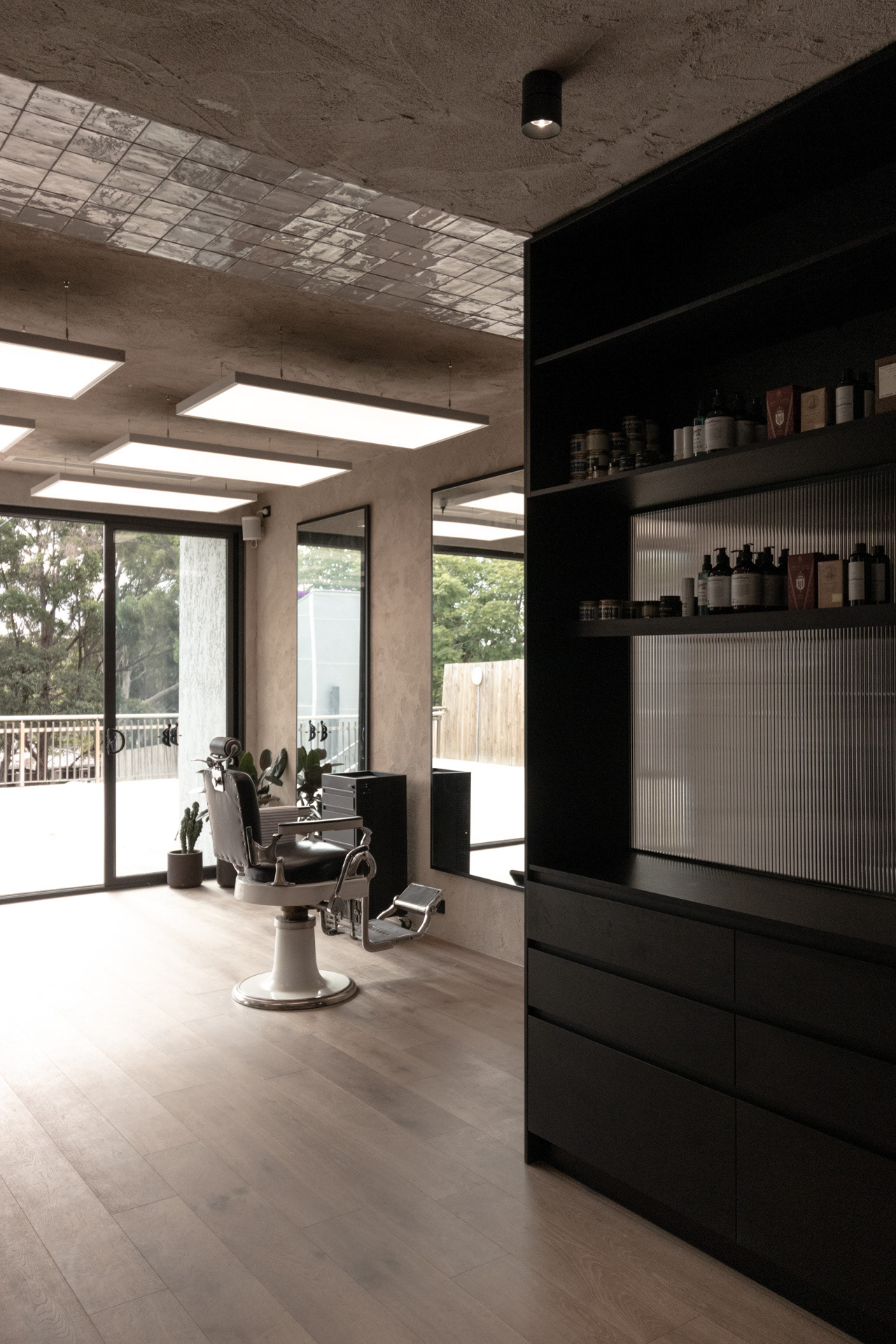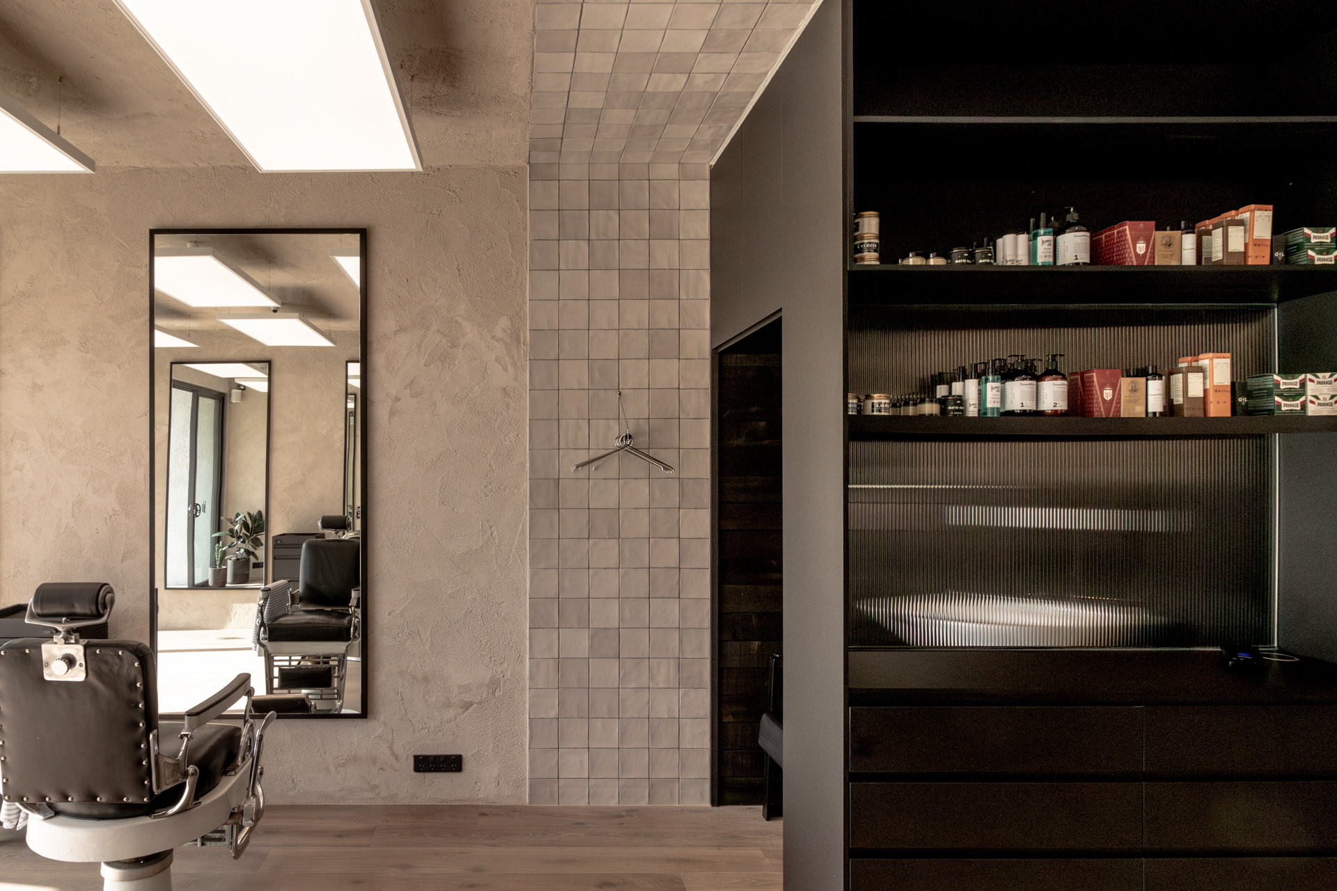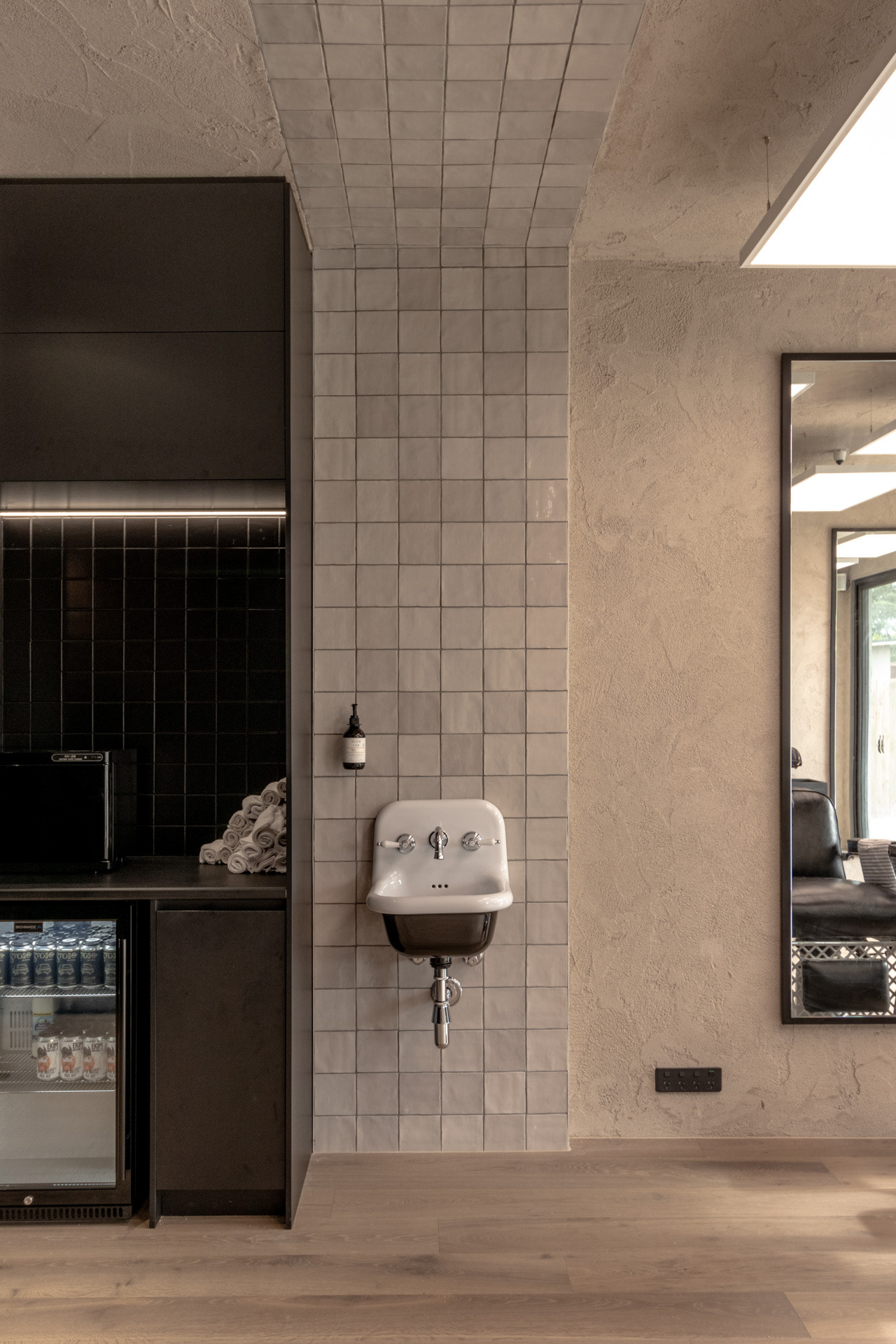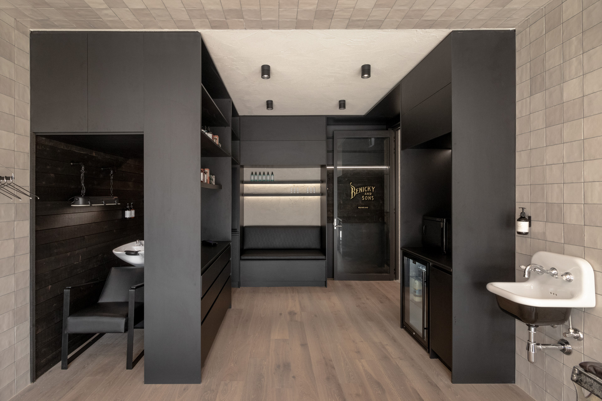 This project was undertaken in 2024 for Benicky & Sons' third Sydney location. The barbershop’s interior fitout design was an evolution of the identity and aesthetic developed for the brand’s first two locations, designed in 2016 and 2020. This venue pays homage to the traditional barbershop aesthetic adopted for the first Mosman location, however shifts towards a more contemporary approach to suit its locality. The fitout is elevated through unique material finishes, featuring lime plaster stucco walls & ceilings, black stained Cedar wall panelling, a ceramic tile ceiling feature and heritage barber chairs and fittings.