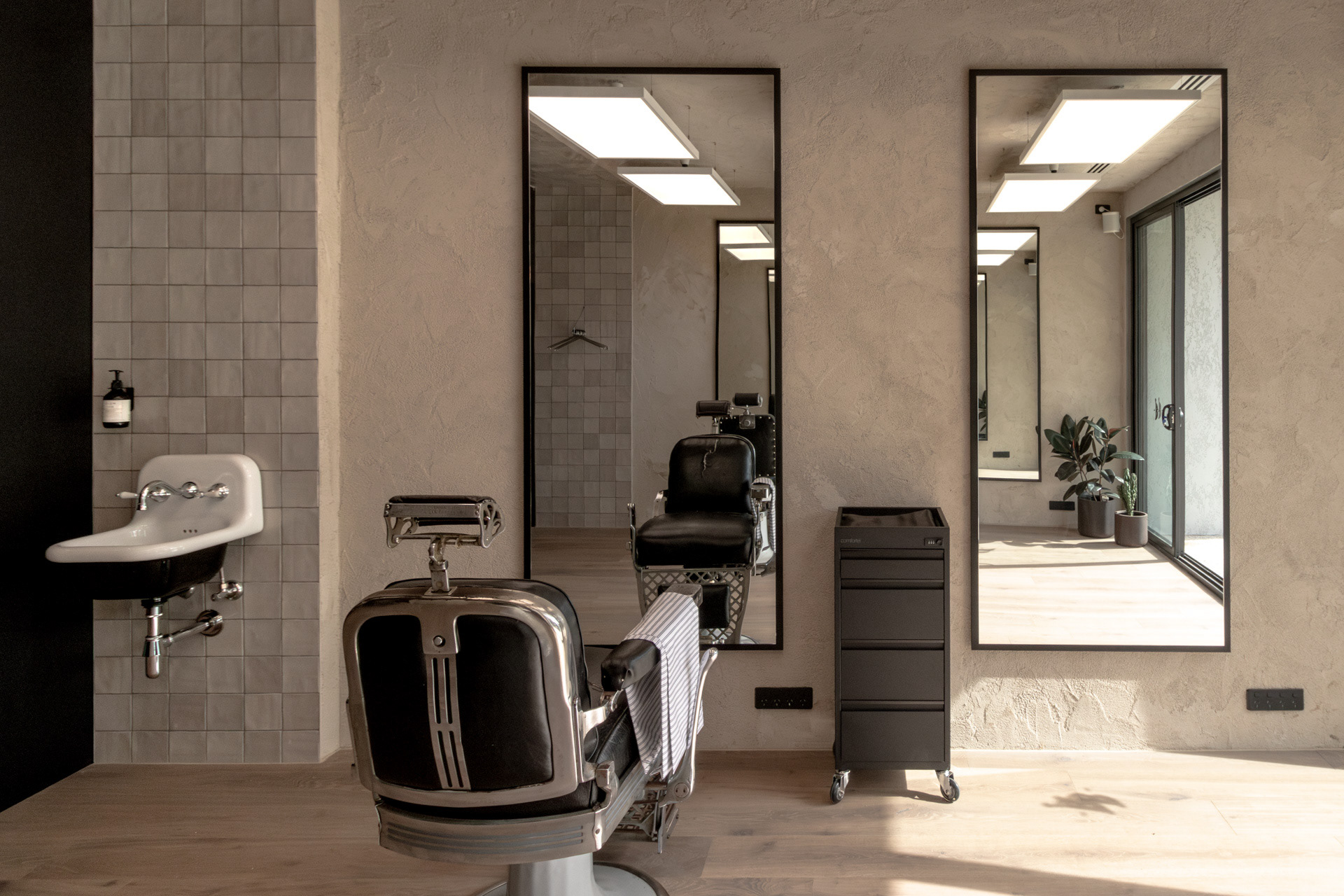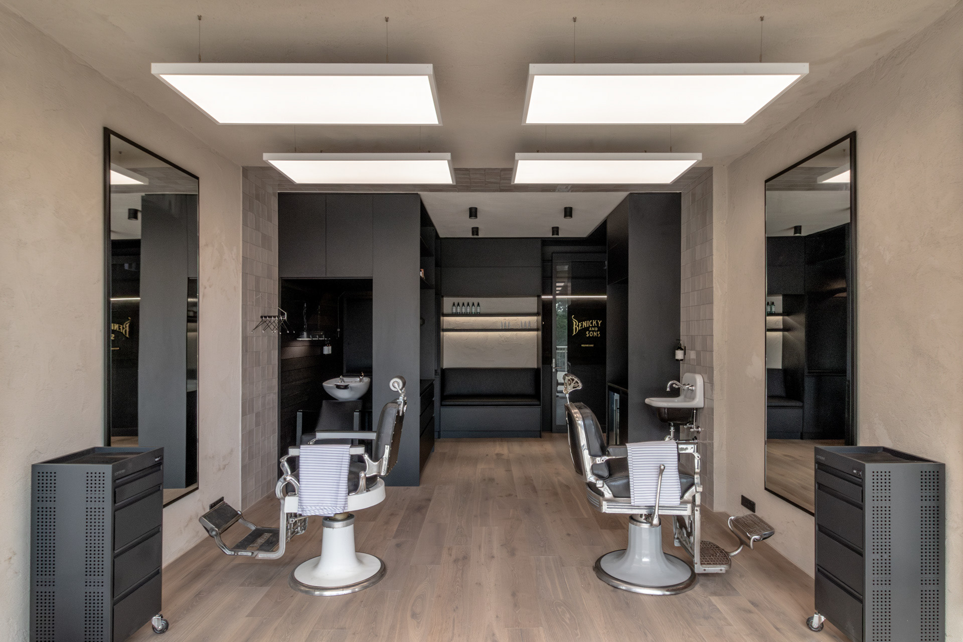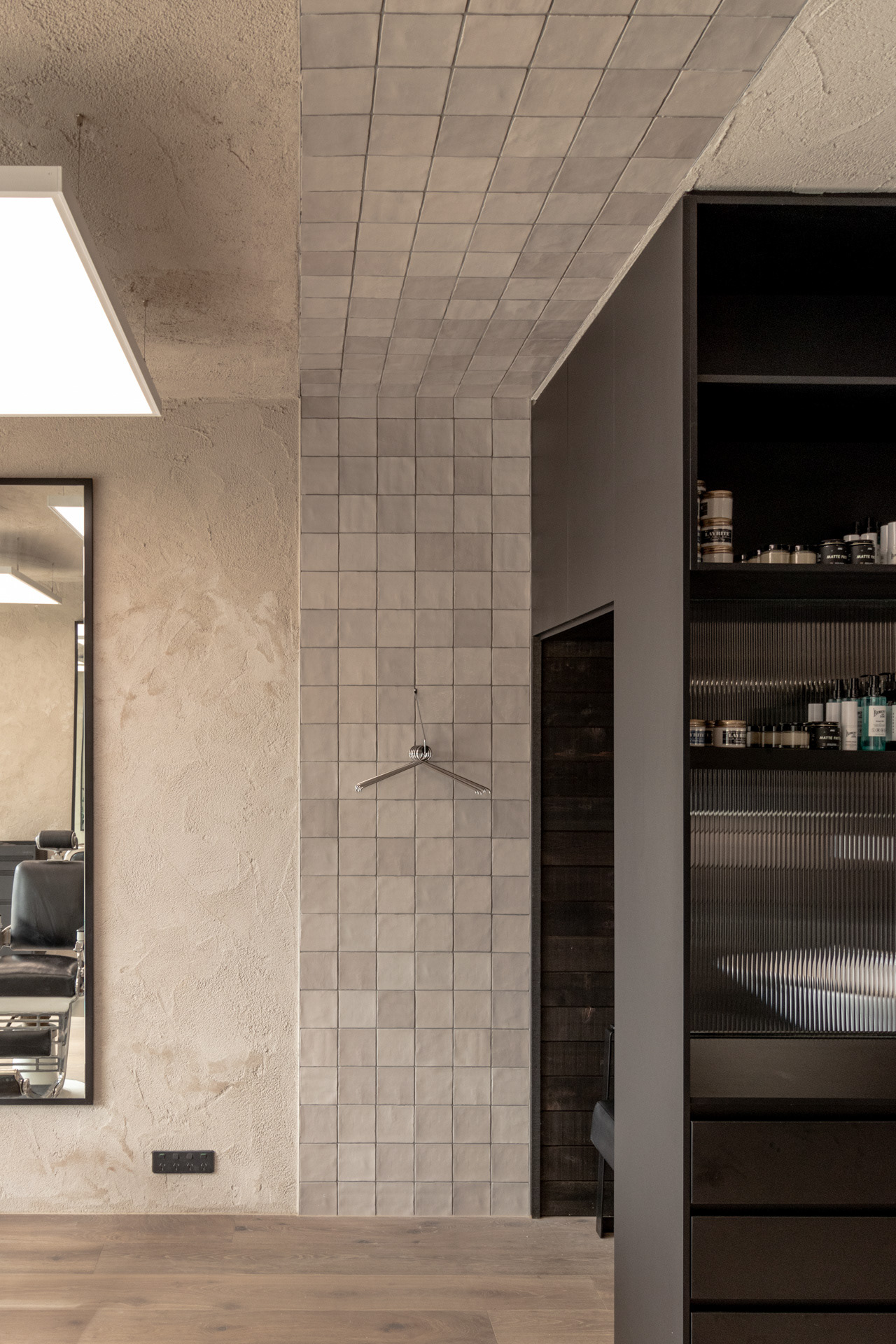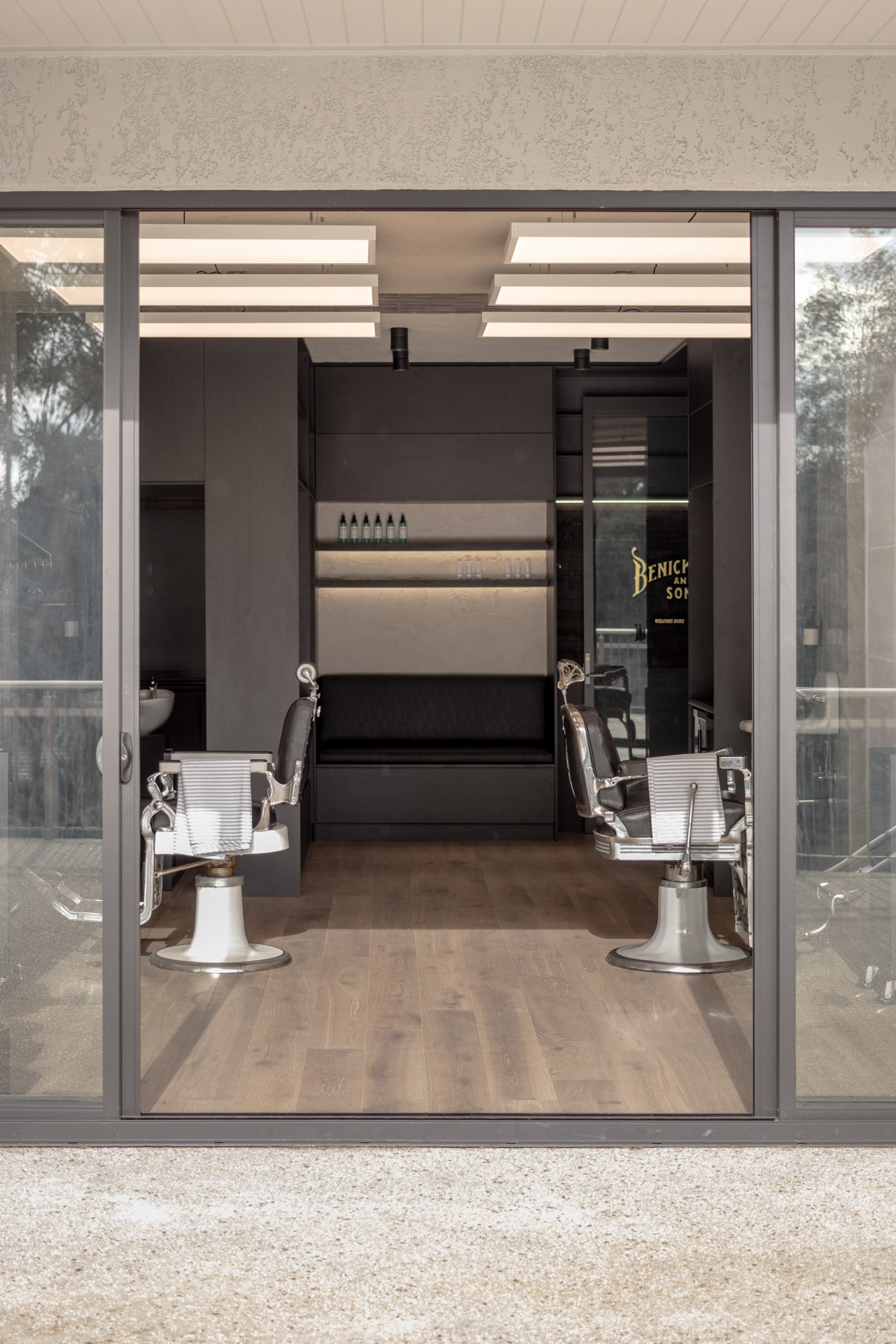 This project was undertaken in 2024 for Benicky & Sons' third Sydney location. The barbershop’s interior fitout design was an evolution of the identity and aesthetic developed for the brand’s first two locations, designed in 2016 and 2020. This venue pays homage to the traditional barbershop aesthetic adopted for the first Mosman location, however shifts towards a more contemporary approach to suit its locality. The fitout is elevated through unique material finishes, featuring lime plaster stucco walls & ceilings, black stained Cedar wall panelling, a ceramic tile ceiling feature and heritage barber chairs and fittings.