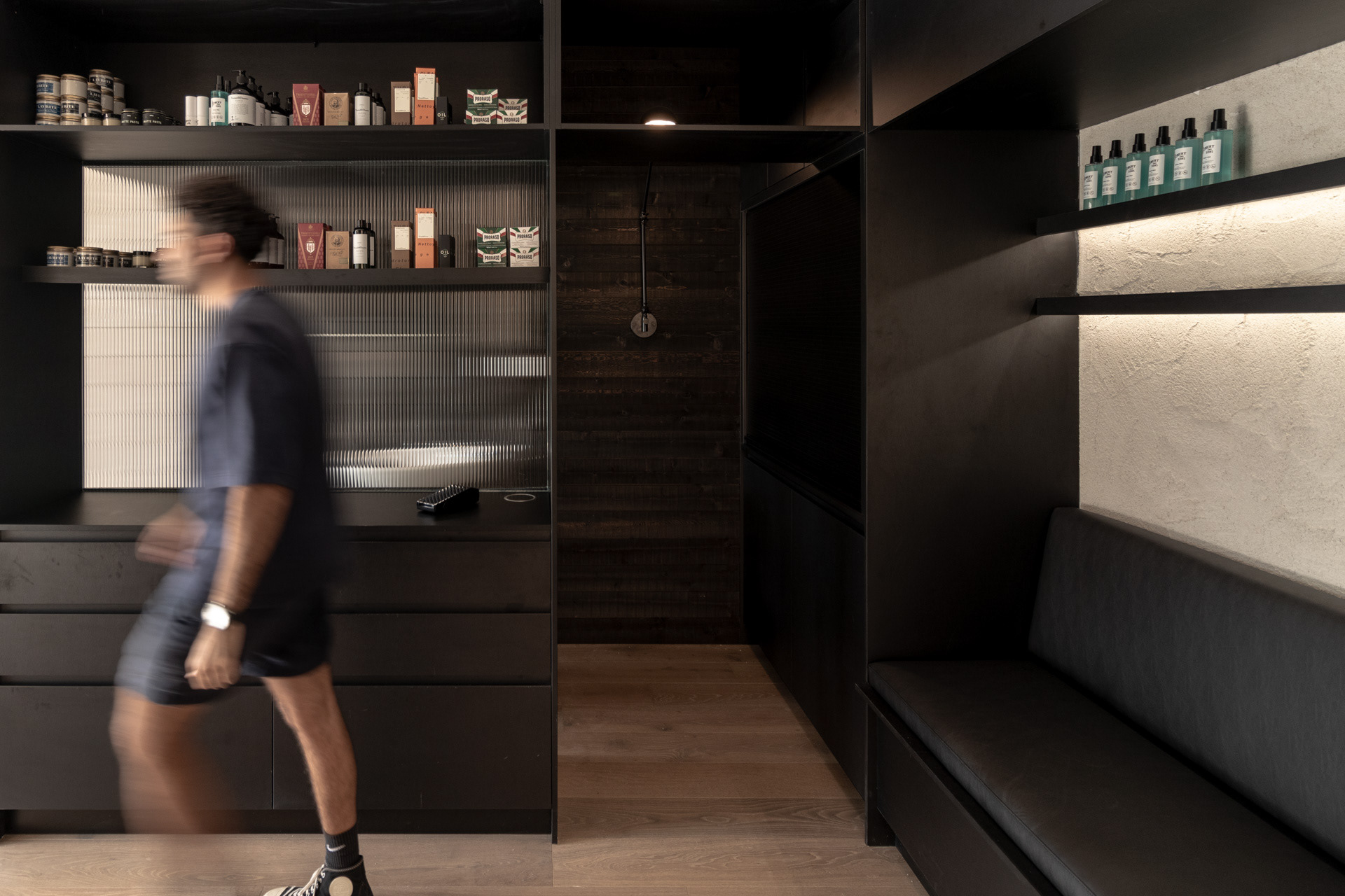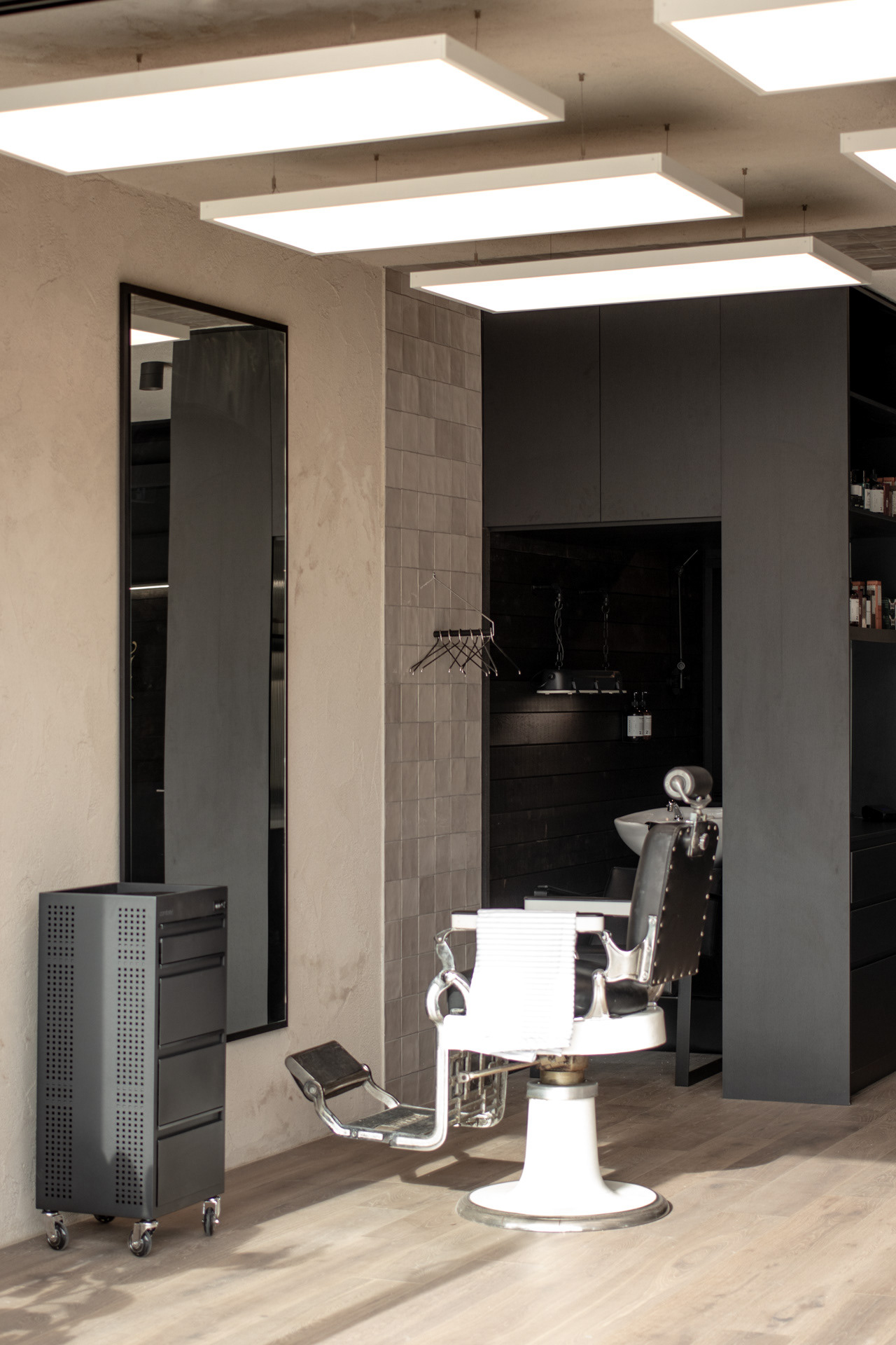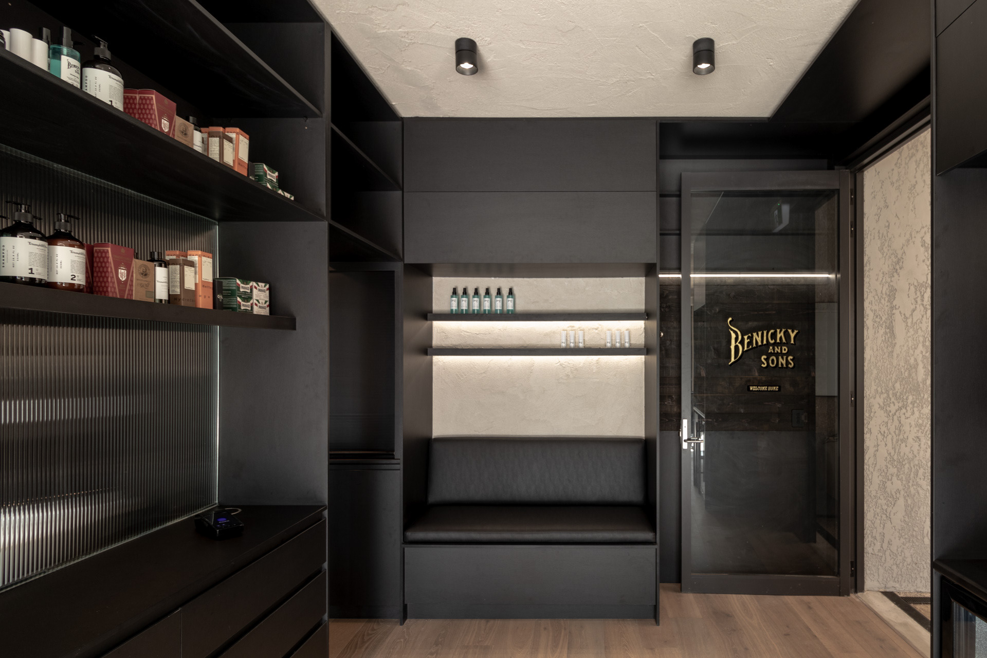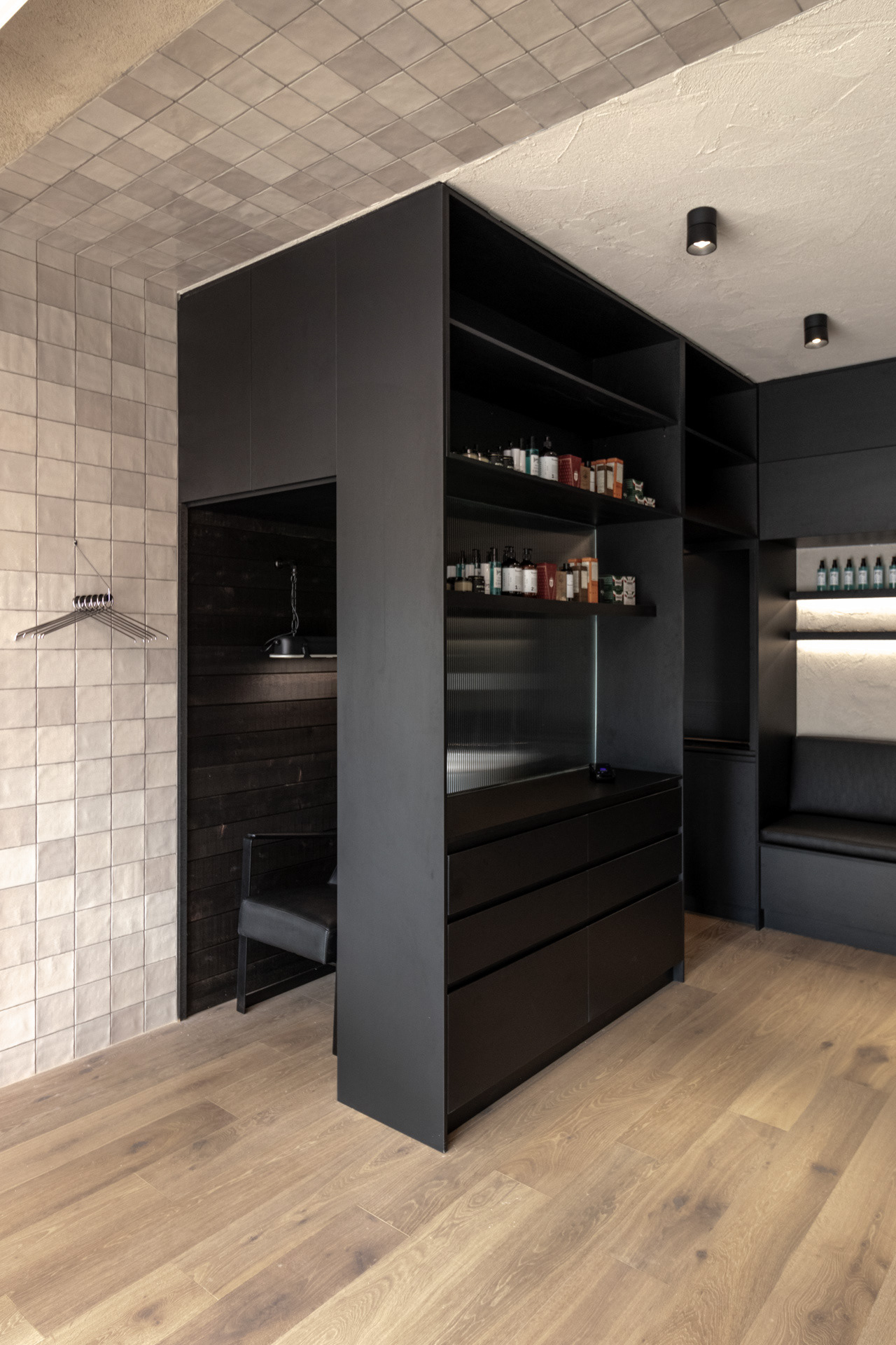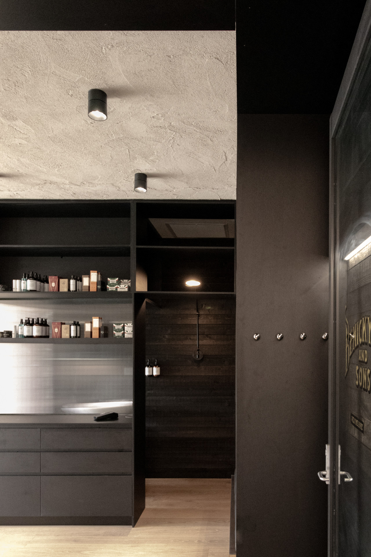 This project was undertaken in 2024 for Benicky & Sons' third Sydney location. The barbershop’s interior fitout design was an evolution of the identity and aesthetic developed for the brand’s first two locations, designed in 2016 and 2020. This venue pays homage to the traditional barbershop aesthetic adopted for the first Mosman location, however shifts towards a more contemporary approach to suit its locality. The fitout is elevated through unique material finishes, featuring lime plaster stucco walls & ceilings, black stained Cedar wall panelling, a ceramic tile ceiling feature and heritage barber chairs and fittings.