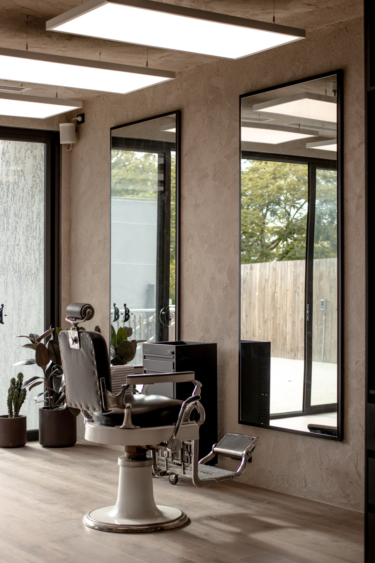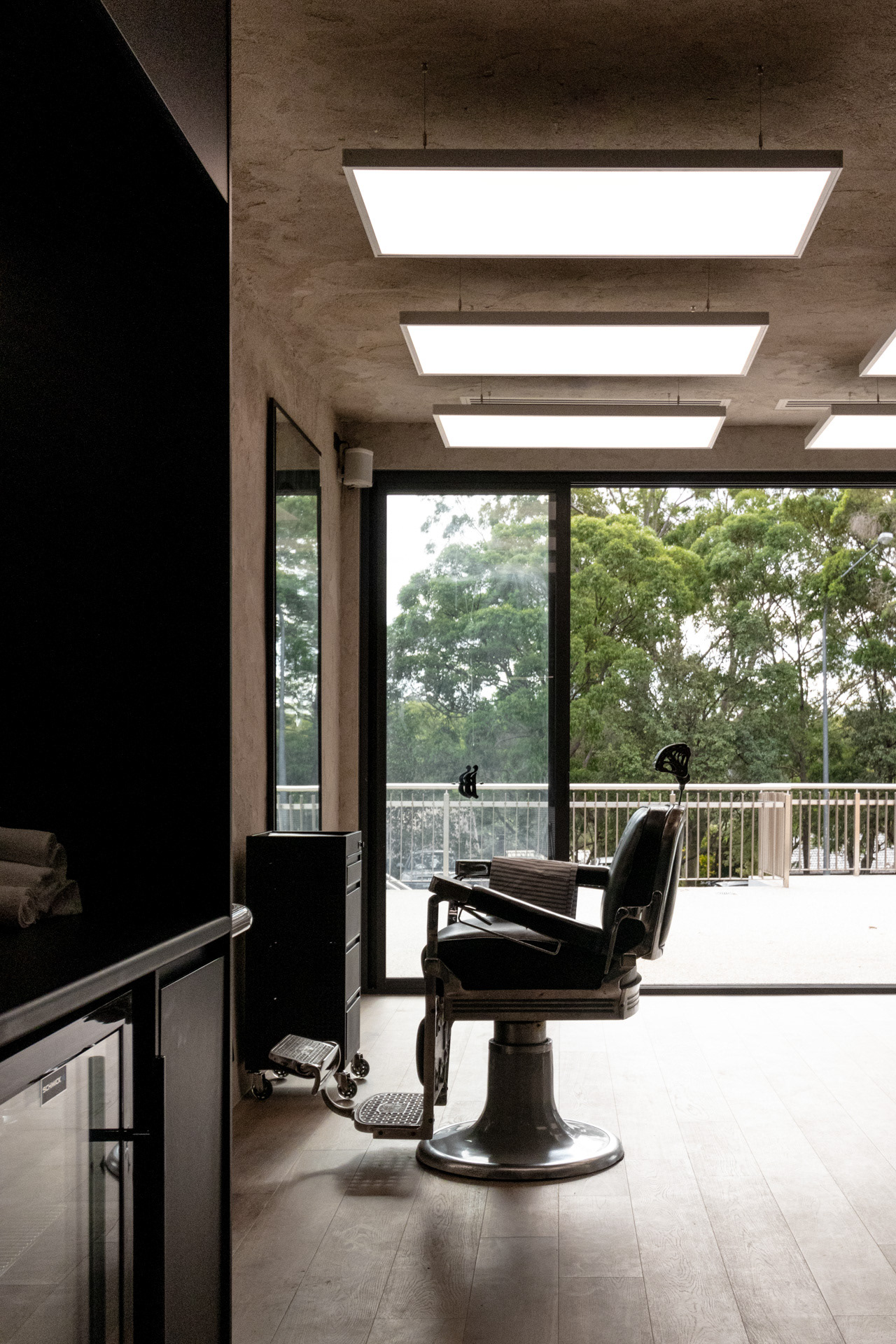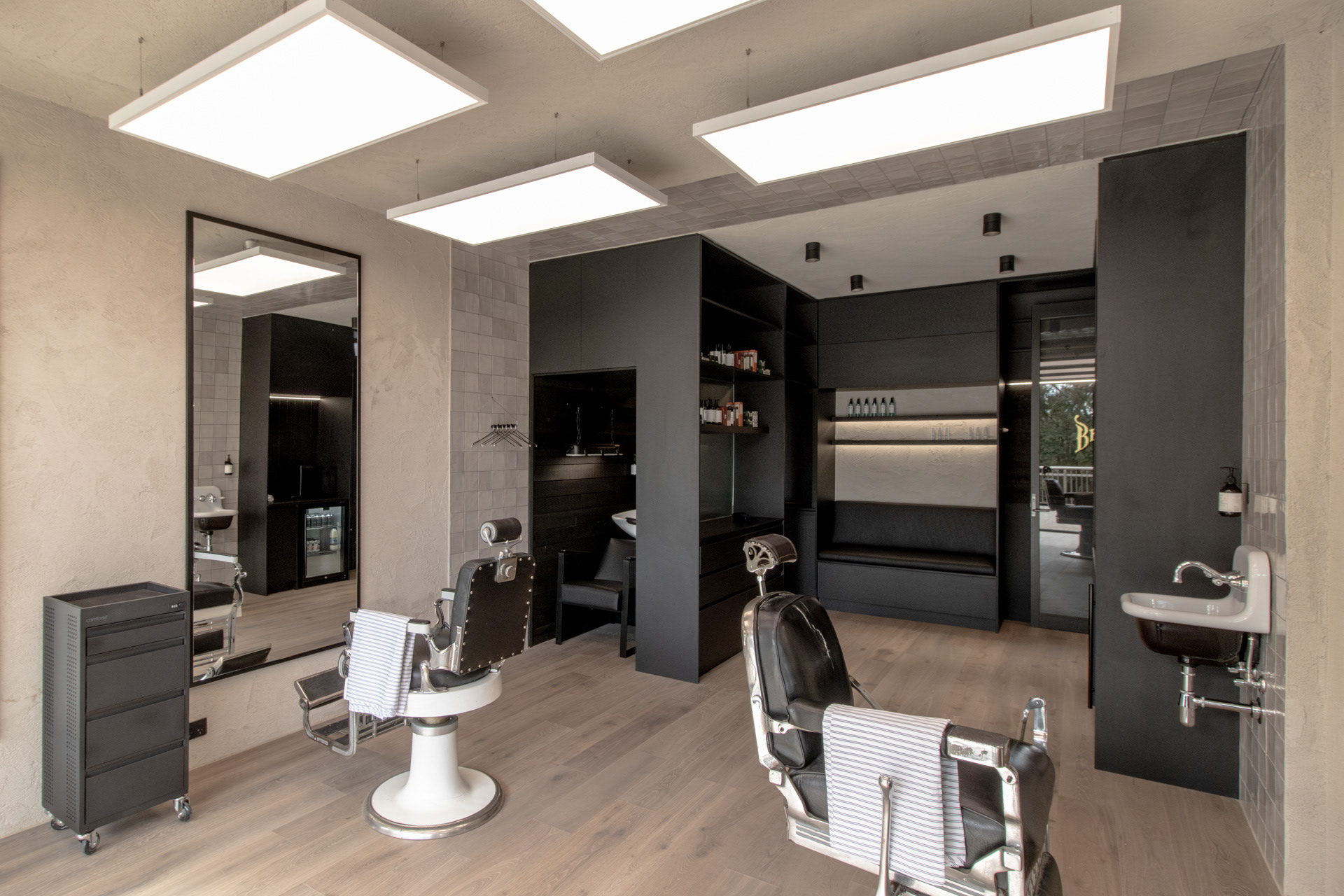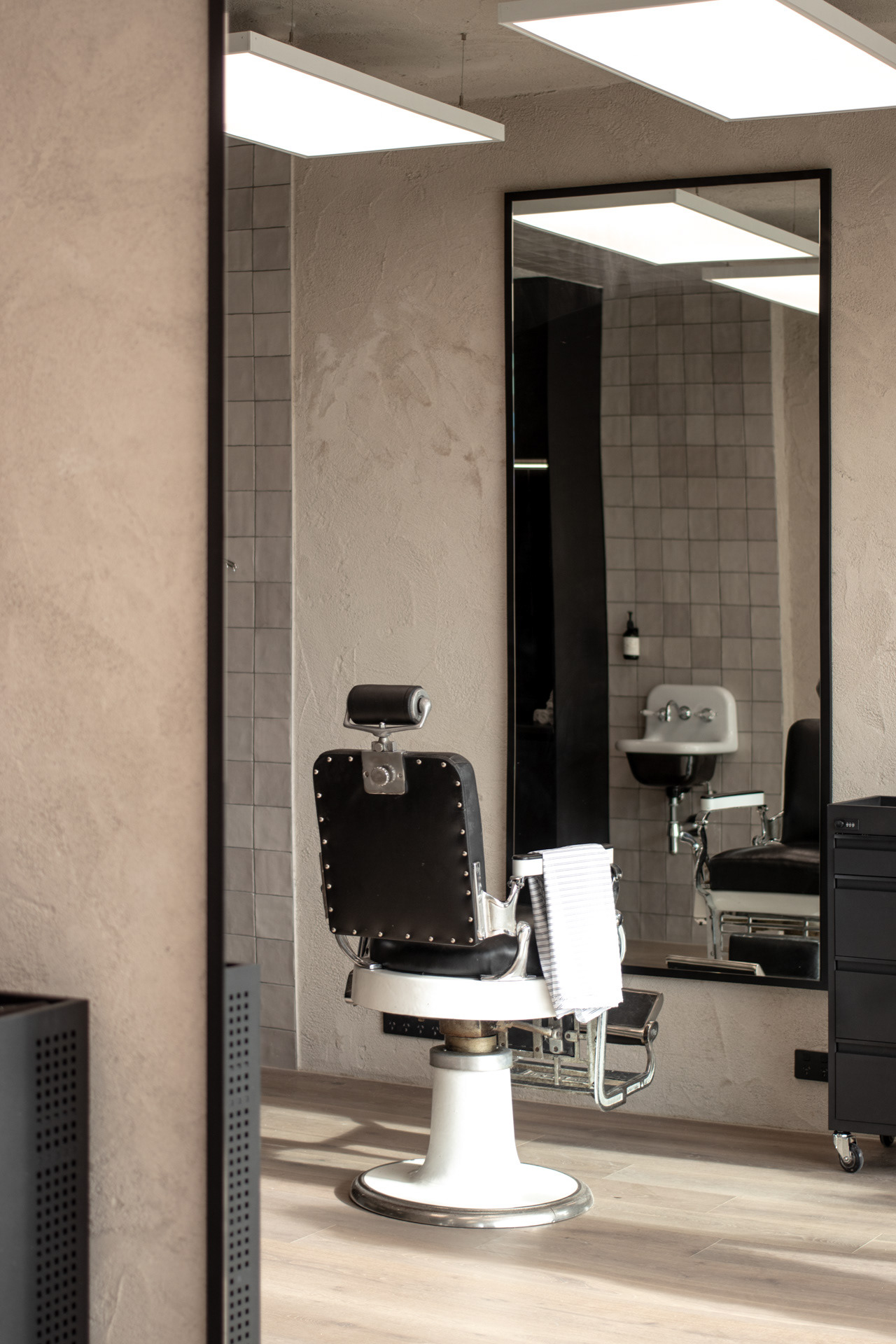 This project was undertaken in 2024 for Benicky & Sons' third Sydney location. The barbershop’s interior fitout design was an evolution of the identity and aesthetic developed for the brand’s first two locations, designed in 2016 and 2020. This venue pays homage to the traditional barbershop aesthetic adopted for the first Mosman location, however shifts towards a more contemporary approach to suit its locality. The fitout is elevated through unique material finishes, featuring lime plaster stucco walls & ceilings, black stained Cedar wall panelling, a ceramic tile ceiling feature and heritage barber chairs and fittings.
