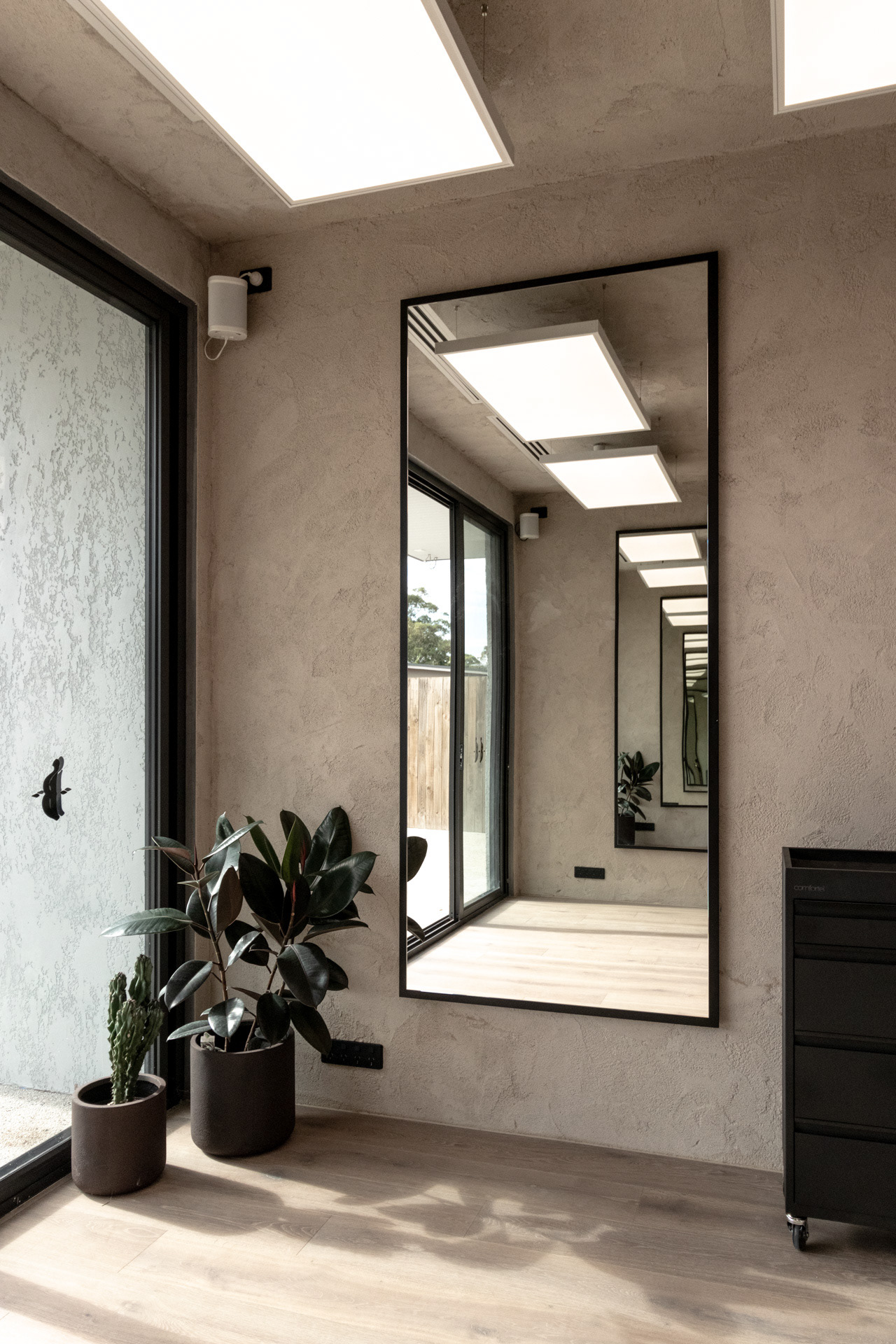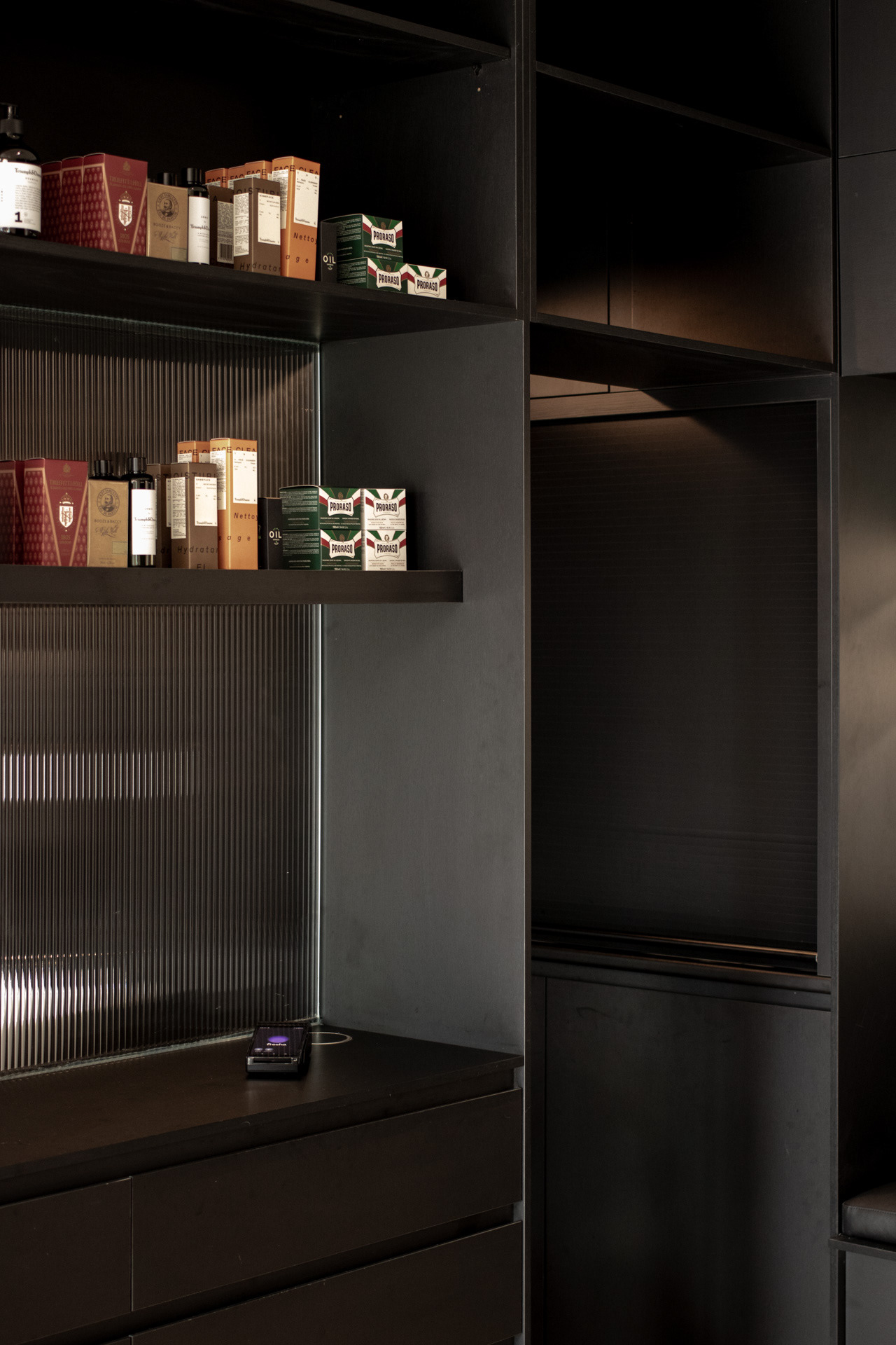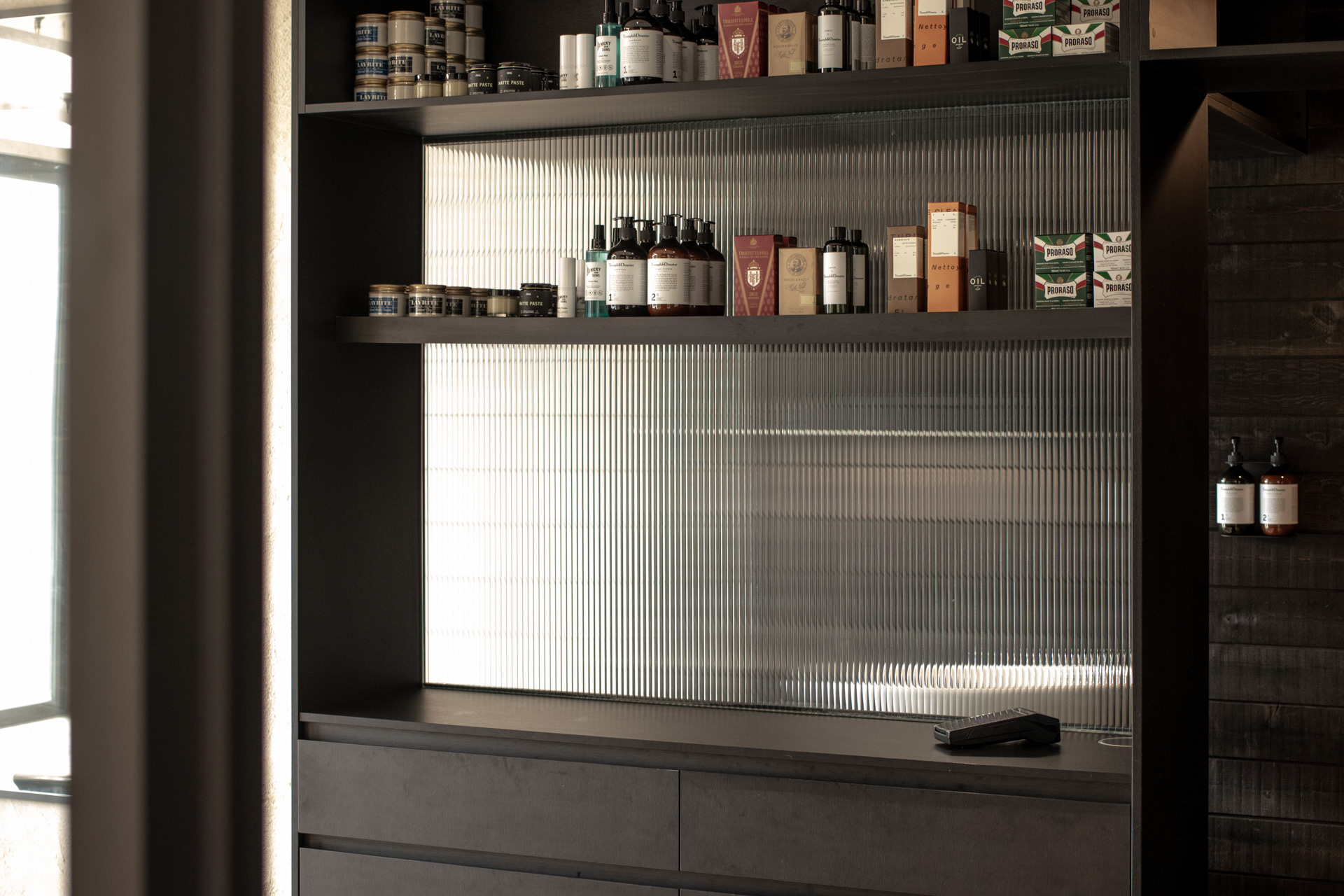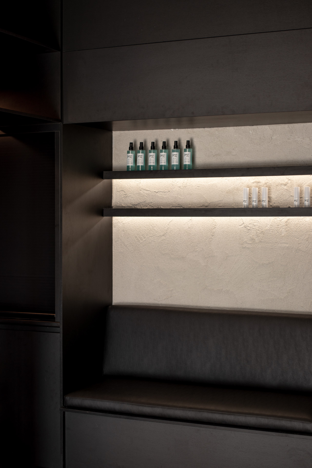 This project was undertaken in 2024 for Benicky & Sons' third Sydney location. The barbershop’s interior fitout design was an evolution of the identity and aesthetic developed for the brand’s first two locations, designed in 2016 and 2020. This venue pays homage to the traditional barbershop aesthetic adopted for the first Mosman location, however shifts towards a more contemporary approach to suit its locality. The fitout is elevated through unique material finishes, featuring lime plaster stucco walls & ceilings, black stained Cedar wall panelling, a ceramic tile ceiling feature and heritage barber chairs and fittings.