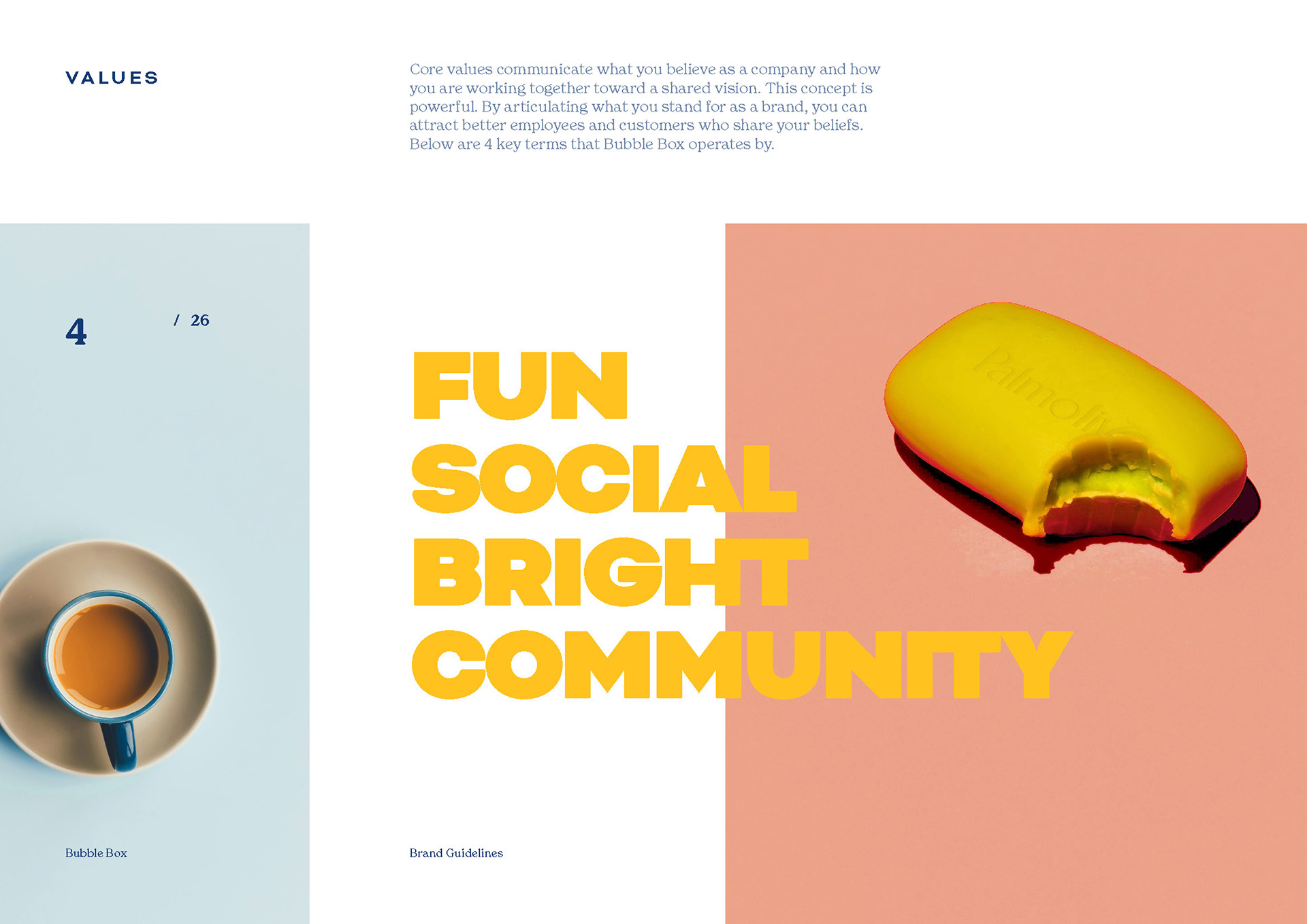 Bubble Box aims to take the chore out of Laundry and turn it into a social event. By providing Laundry facilities alongside a Cafe/Bar and lounge, Bubble Box provides a warm and enjoyable space with a strong community focus. The Brand identity implements a bright and bold colour palette to aid in communicating the Brand's vision for community and inclusivity. The brand introduces an overall fun and playful sense through imagery and typographical choices, aimed at distancing the brand from the typically perceived dullness of public laundries. This project was part of a full suite package, in which I produced the Brand's visual identity, the physical fitout design, and the business' website. See the 'Bubble Box Interior' project for the remainder of this package.
