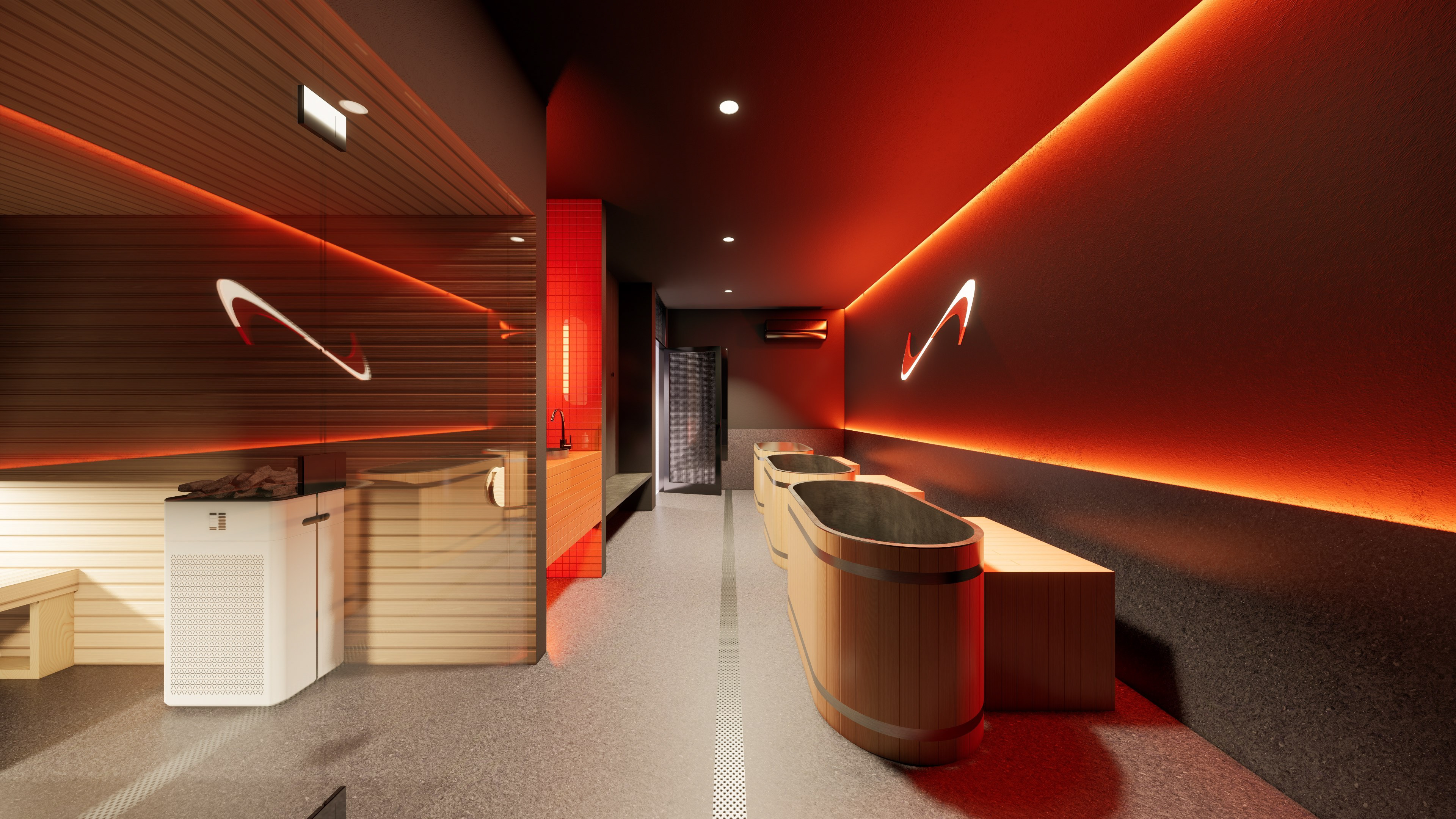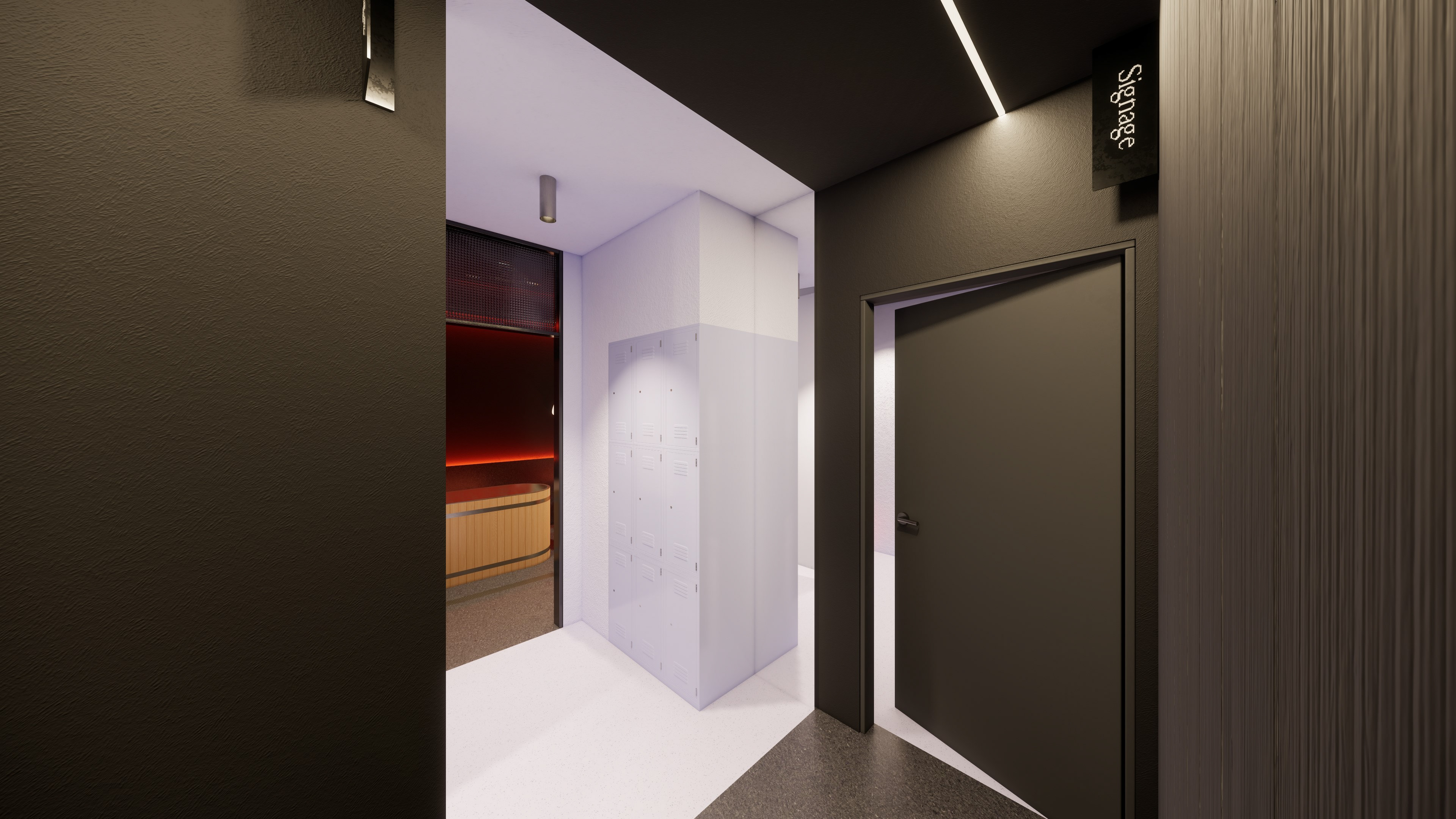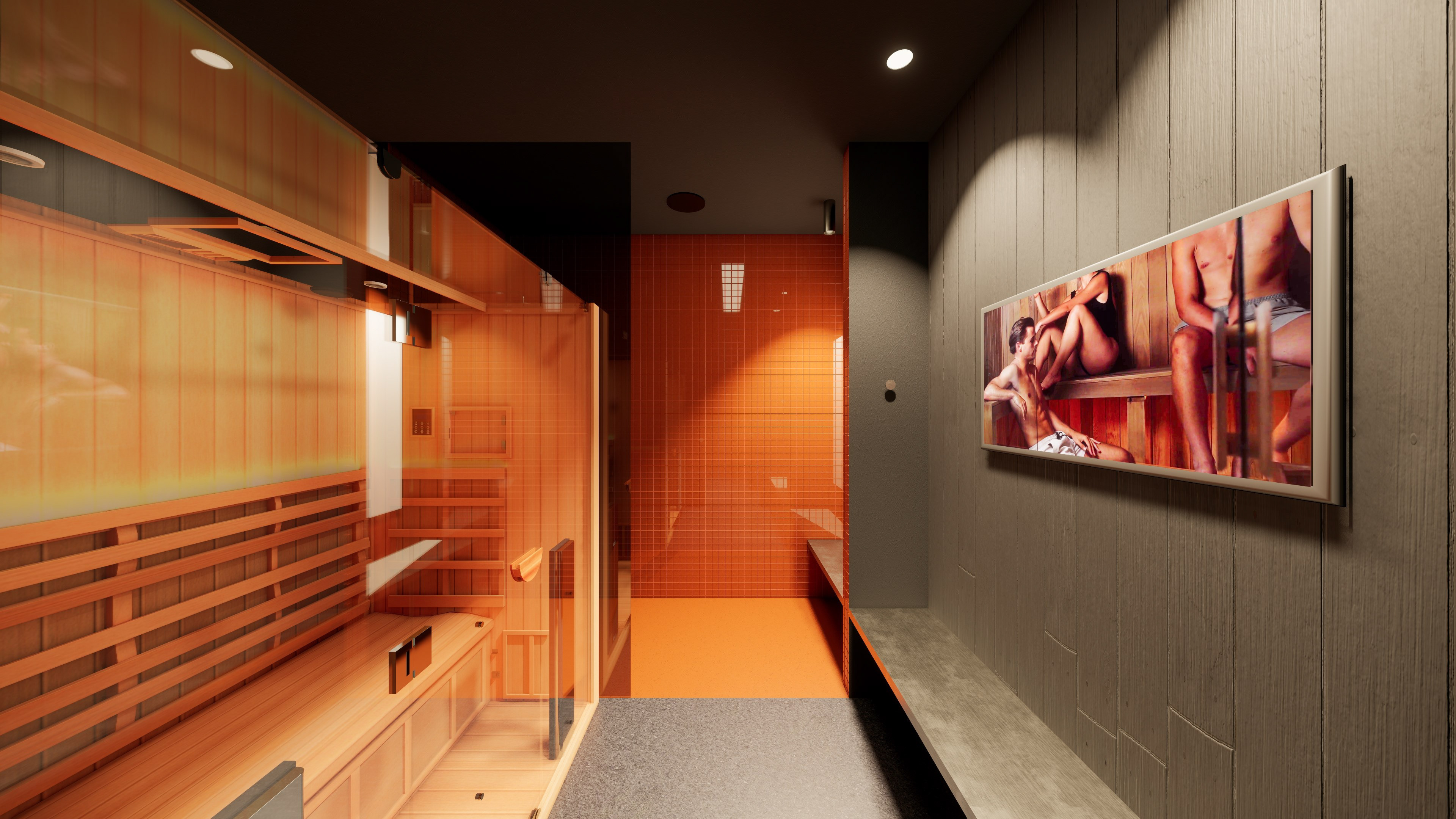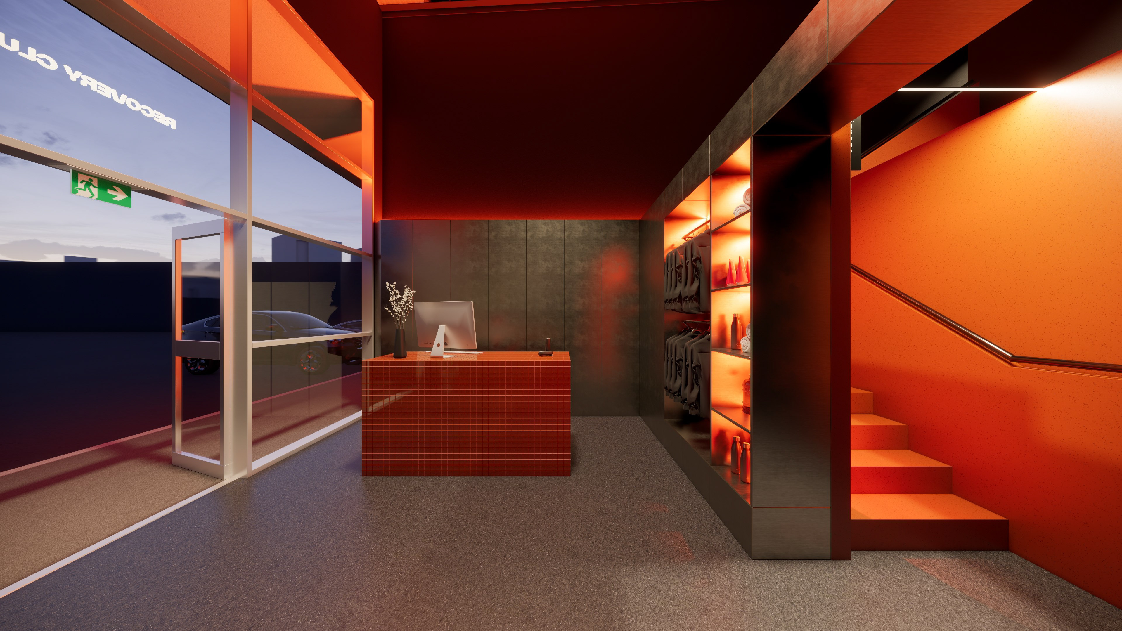 Tasked with the end-to-end brand architecture and interior fitout, the objective for Recovery Club was to move away from the clinical sterile tropes of modern wellness in favour of a moody, athletic sanctuary. Physically, the space is dictated by the brand’s signature ‘Sinopia’ colour, a feature brick red that speaks to infrared heat and provides a high-vis wayfinding tool through the darkened, monolithic interior. In the reception, a grid-tiled, monolithic desk serves as a structured anchor, juxtaposed against the diffuse, atmospheric glow of the corridors. The material palette reinforces the sensory journey of temperature contrast therapy. Handcrafted cedar saunas offer a warm, tactile envelope, while brushed stainless steel and raw concrete evoke the bracing, industrial chill of the ice baths. By treating the brand and the fitout as a singular, cohesive organism, Recovery Club offers a curated environment where the ritual of recovery becomes a shared social event.