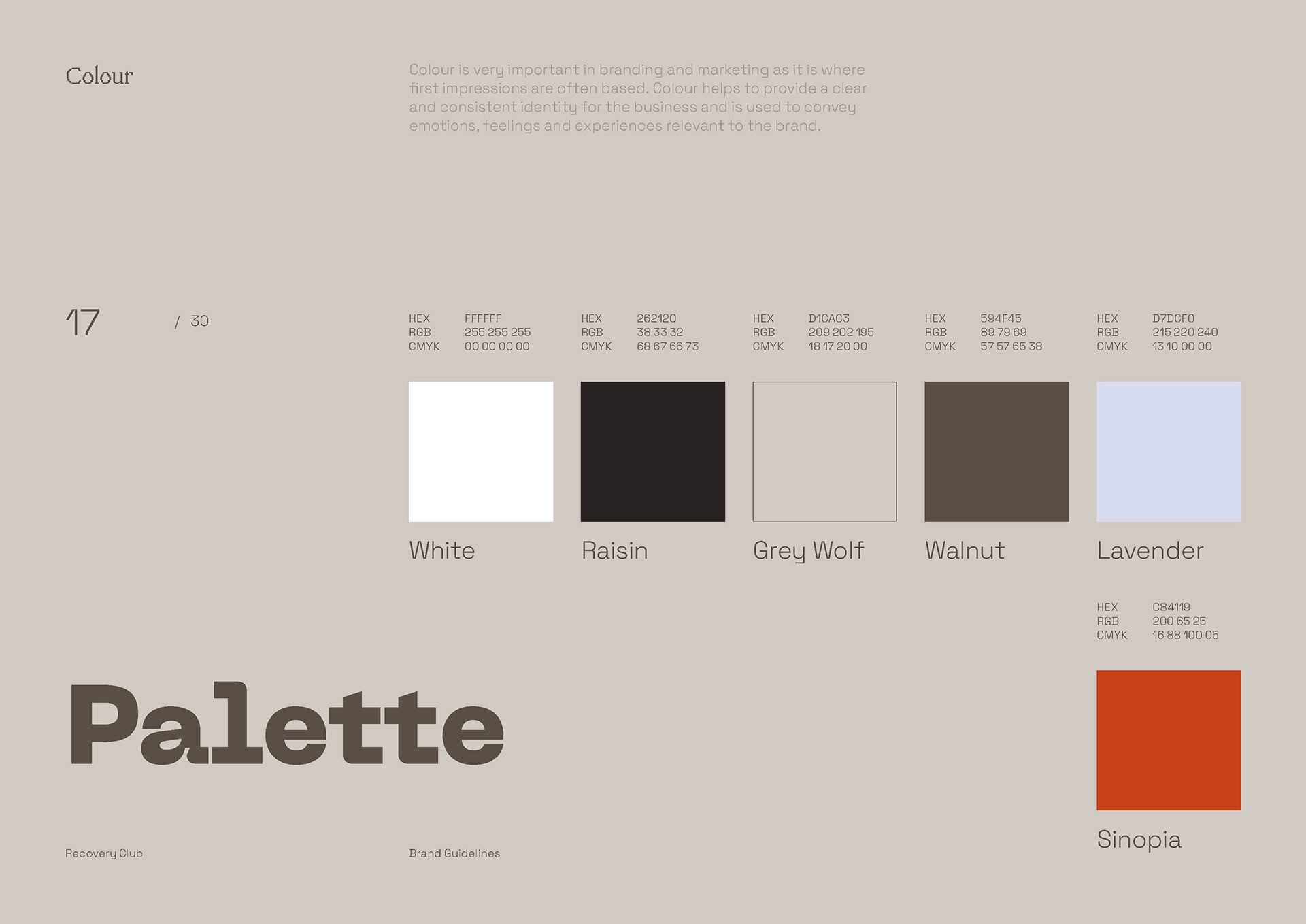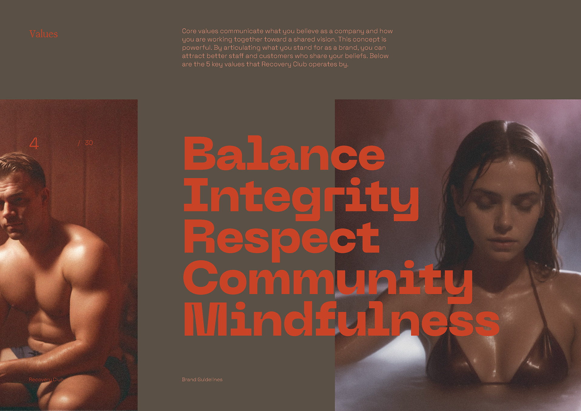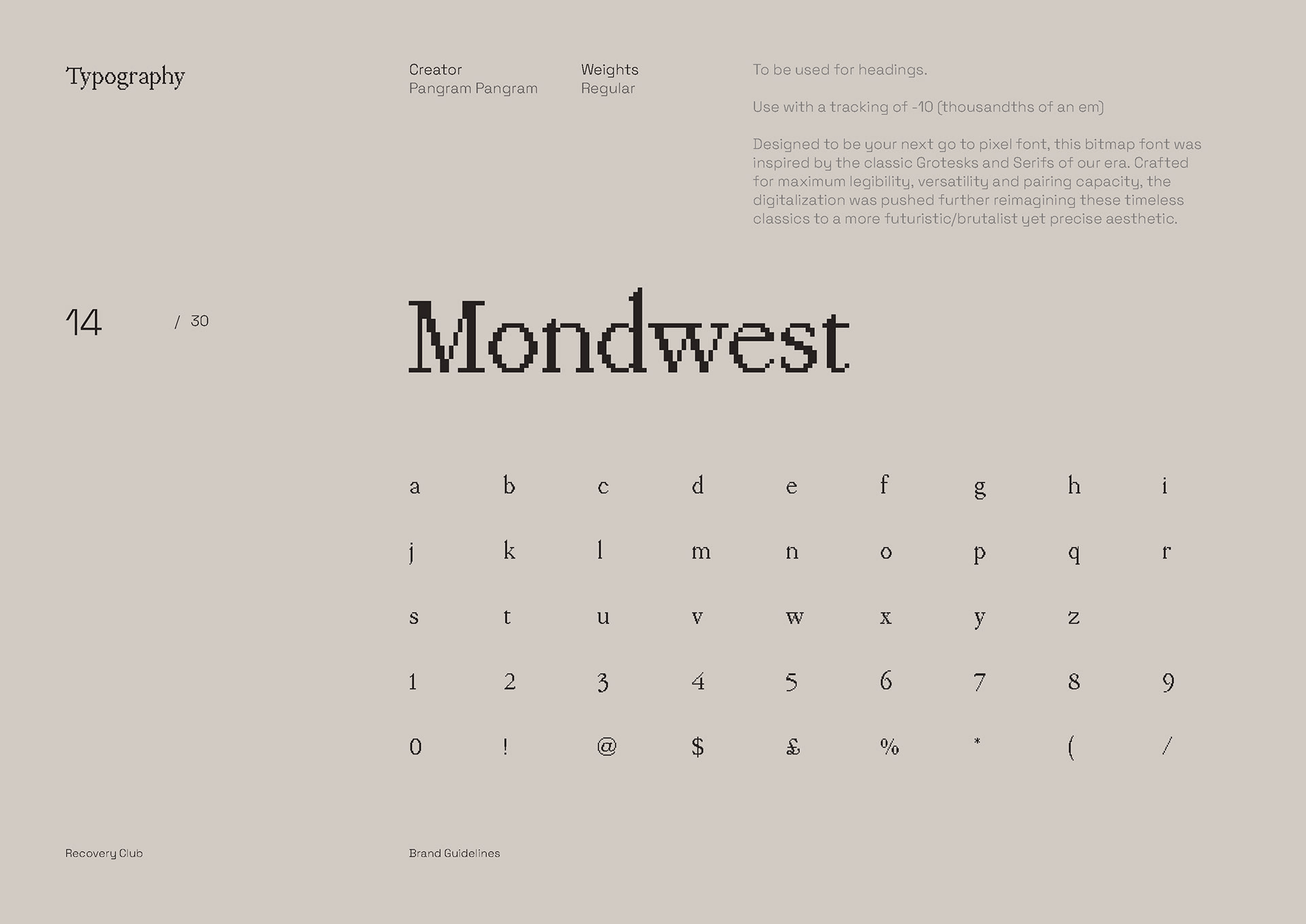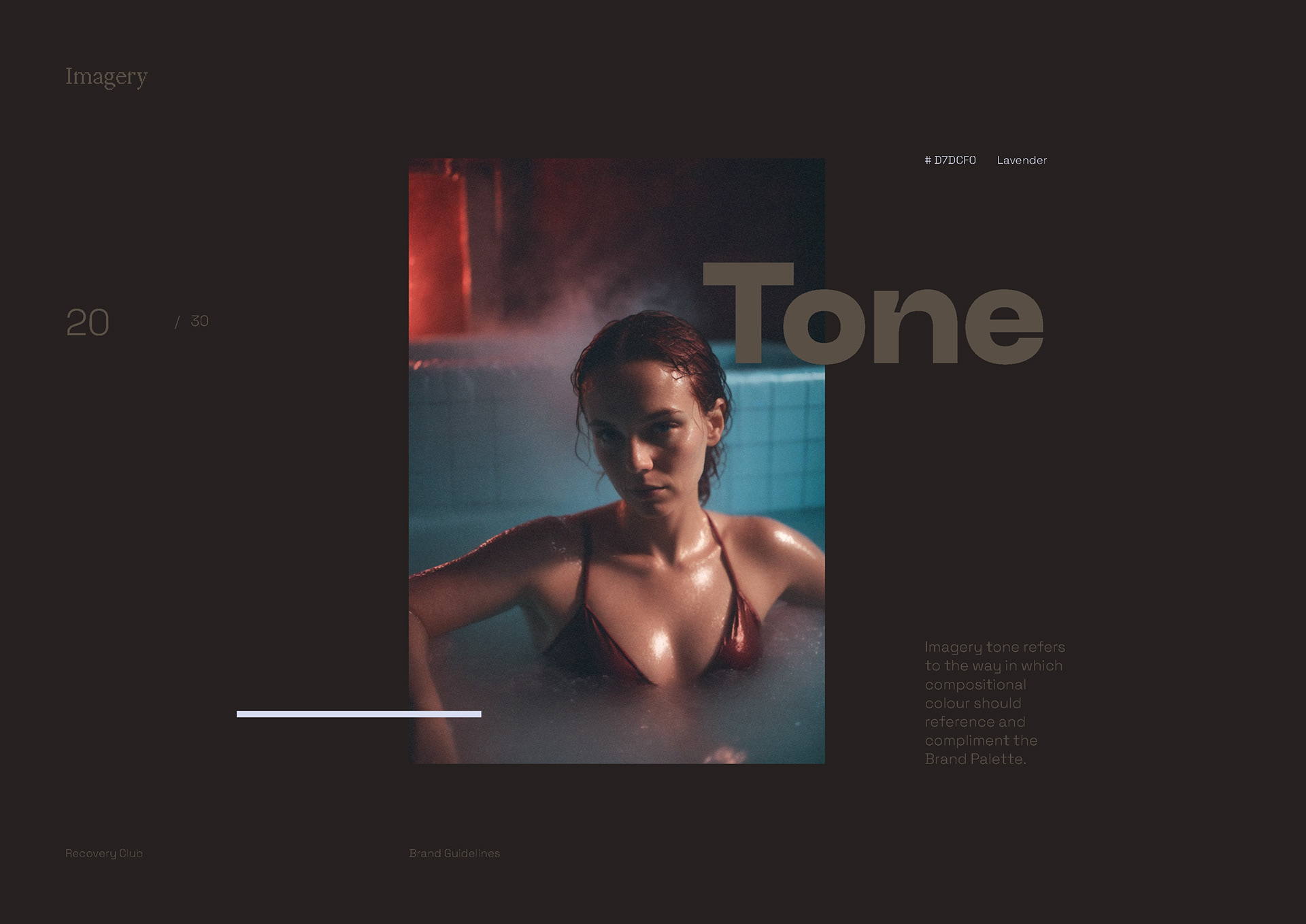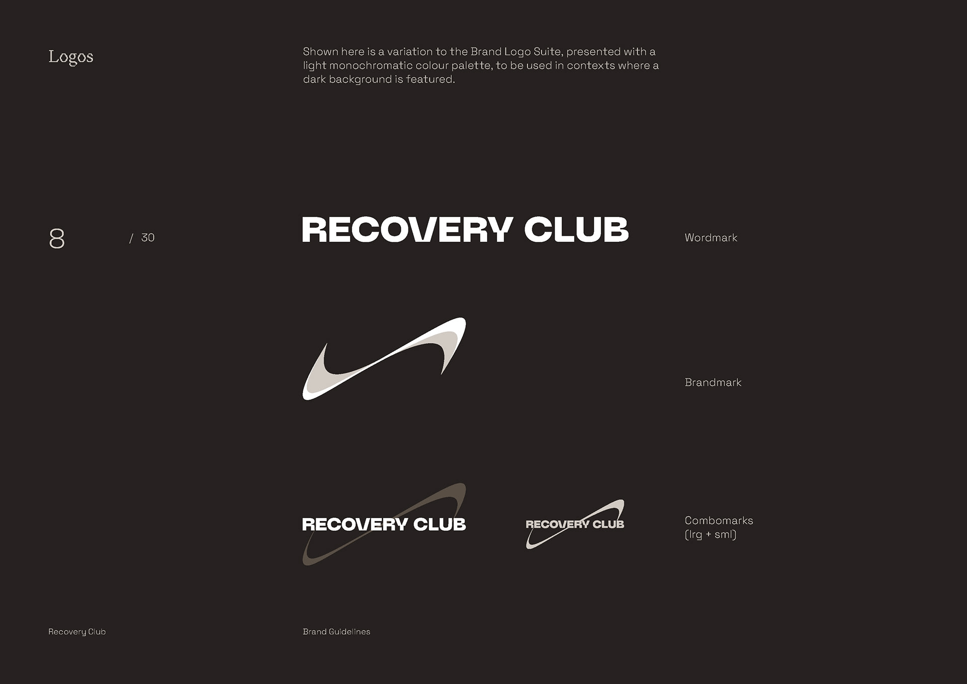 The identity for Recovery Club was designed to subvert the clinical, sterile aesthetic typical of modern wellness, opting instead for a "vintage-athletic" language reimagined through a brutalist lens. The objective was to create a brand that feels as much like a high-performance lab as it does a social sanctuary. The primary brandmark, the ‘Wave’, serves as the conceptual anchor - a fluid representation of infrared wavelength energy and the repetitive cadence of training and restoration. It is a symbol of the yin and yang inherent in contrast therapy; the constant transition between fire and ice. The typographic system utilizes a rigid, machine-inspired hierarchy to reinforce the brand's disciplined nature. Neue Machina provides a robotic, meticulously crafted precision, while the pixelated Mondwest introduces a futuristic, digital texture that references the intersection of science and sport. The palette is centered on ‘Sinopia’, a high-octane brick red that speaks directly to the studio’s infrared offering. It is balanced by a suite of warm, moody neutrals (Raisin, Grey Wolf, and Walnut). Complemented by a photography style defined by heavy film grain and diffuse light, the resulting identity positions recovery not as a solitary chore, but as a shared, social event for the modern athlete.