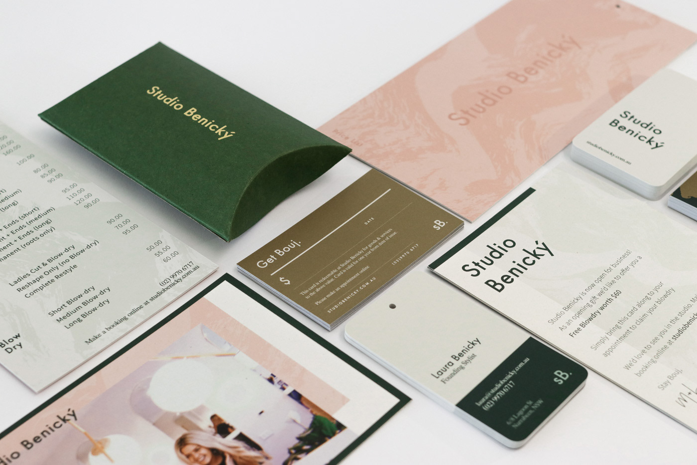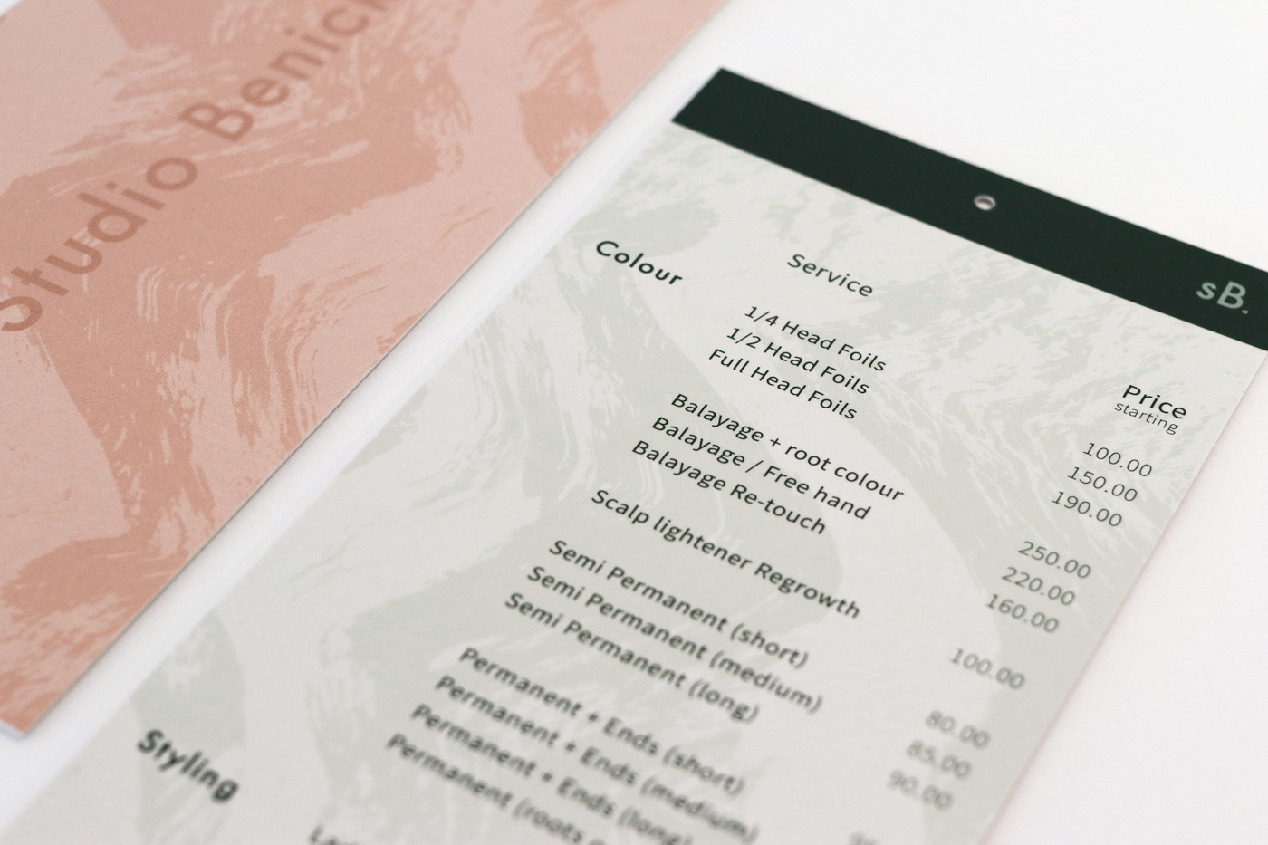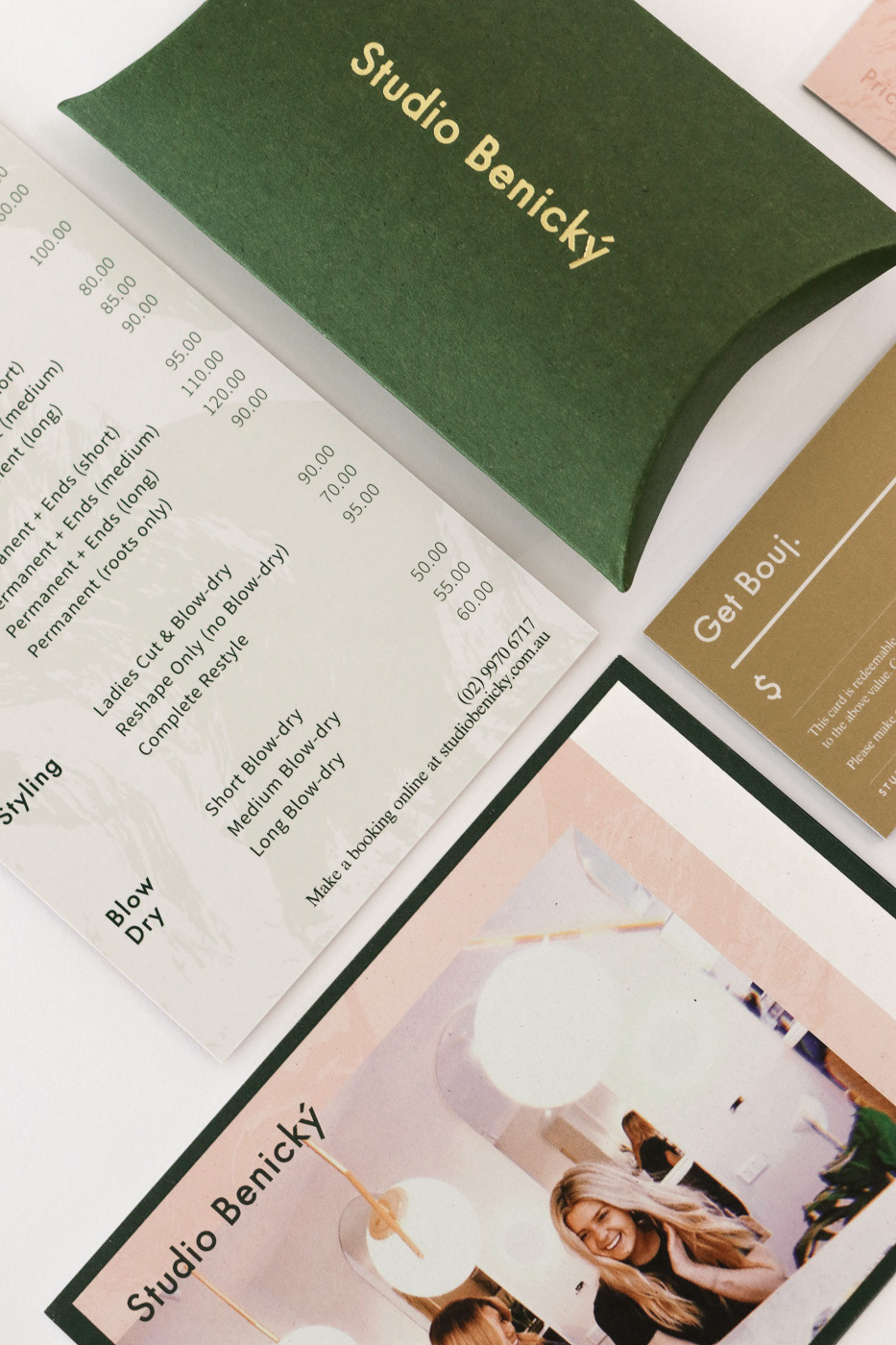 I carried out the Brand Design and all stationary design for Studio Benicky, a women's hair studio on Sydney's Northern Beaches. This included designing business cards, gift cards, price lists and other print media. Business cards - CMYK Offset print with Raised UV on Velvet soft touch coated cardstock Gift Cards - CMYK Offset print + PMS Gold on Matt Celloglazed cardstock Pillow Boxes - Gold Foil print on Recycled card pillow box Blow-Dry Card - CMYK Offset print on Envirocare Recycled Cardstock Price List - CMYK Offset print on Matt Celloglazed cardstock
