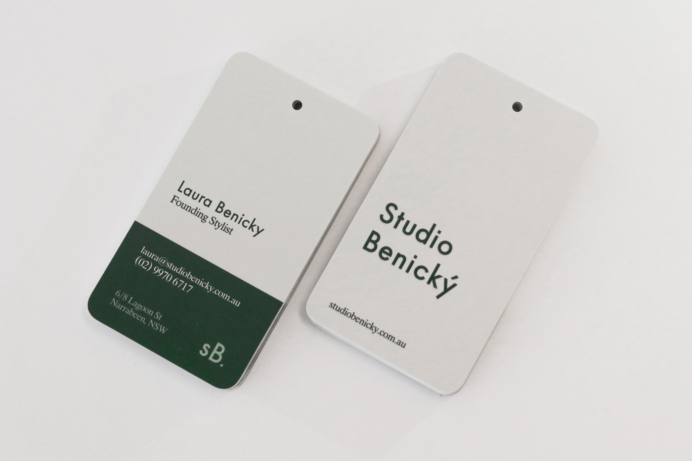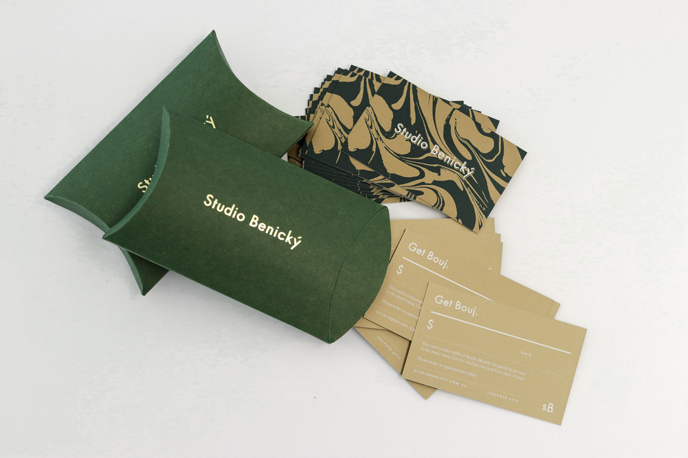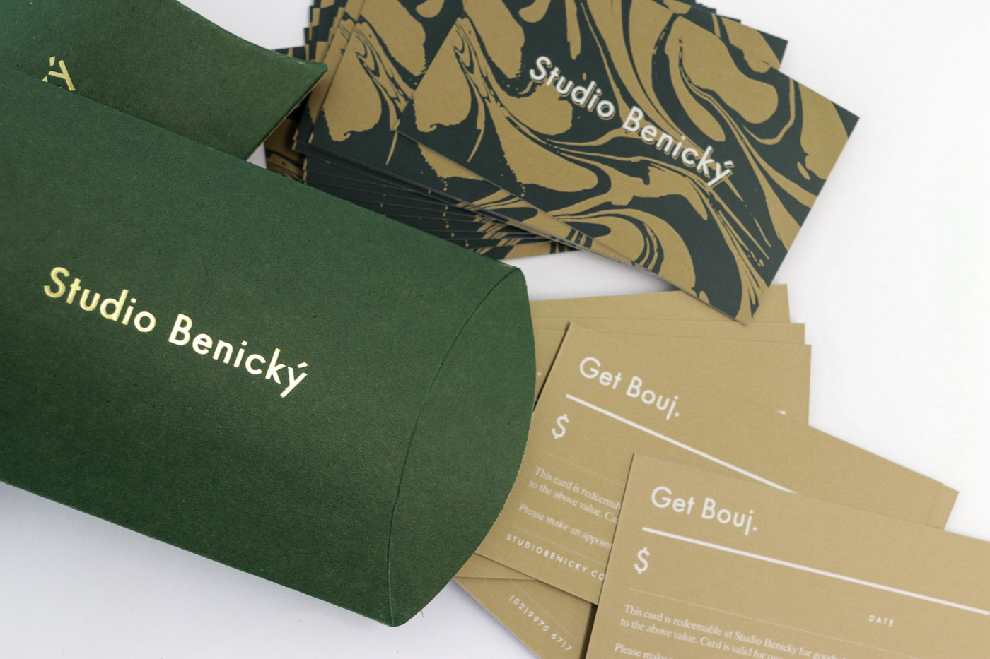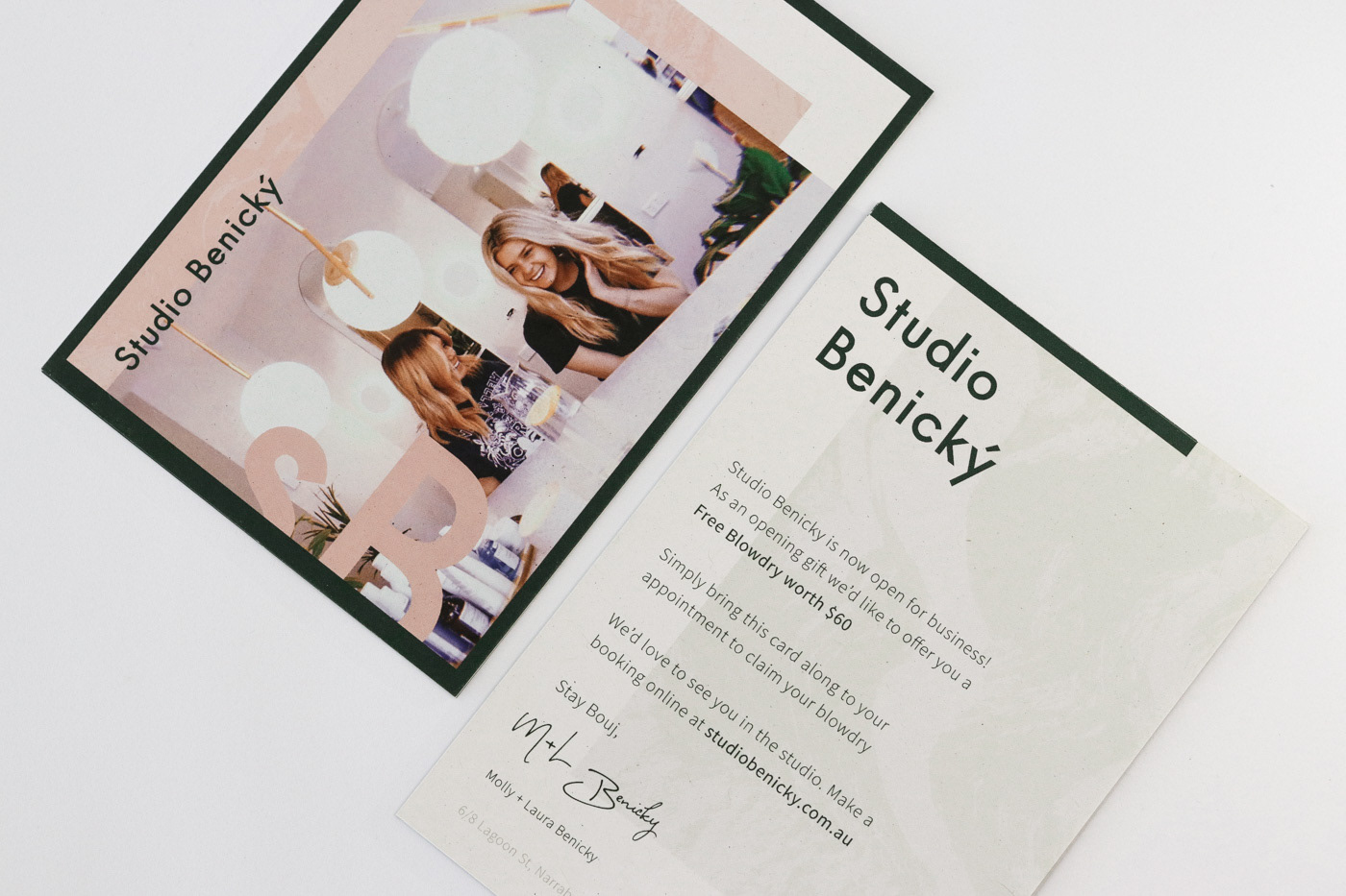 I carried out the Brand Design and all stationary design for Studio Benicky, a women's hair studio on Sydney's Northern Beaches. This included designing business cards, gift cards, price lists and other print media. Business cards - CMYK Offset print with Raised UV on Velvet soft touch coated cardstock Gift Cards - CMYK Offset print + PMS Gold on Matt Celloglazed cardstock Pillow Boxes - Gold Foil print on Recycled card pillow box Blow-Dry Card - CMYK Offset print on Envirocare Recycled Cardstock Price List - CMYK Offset print on Matt Celloglazed cardstock